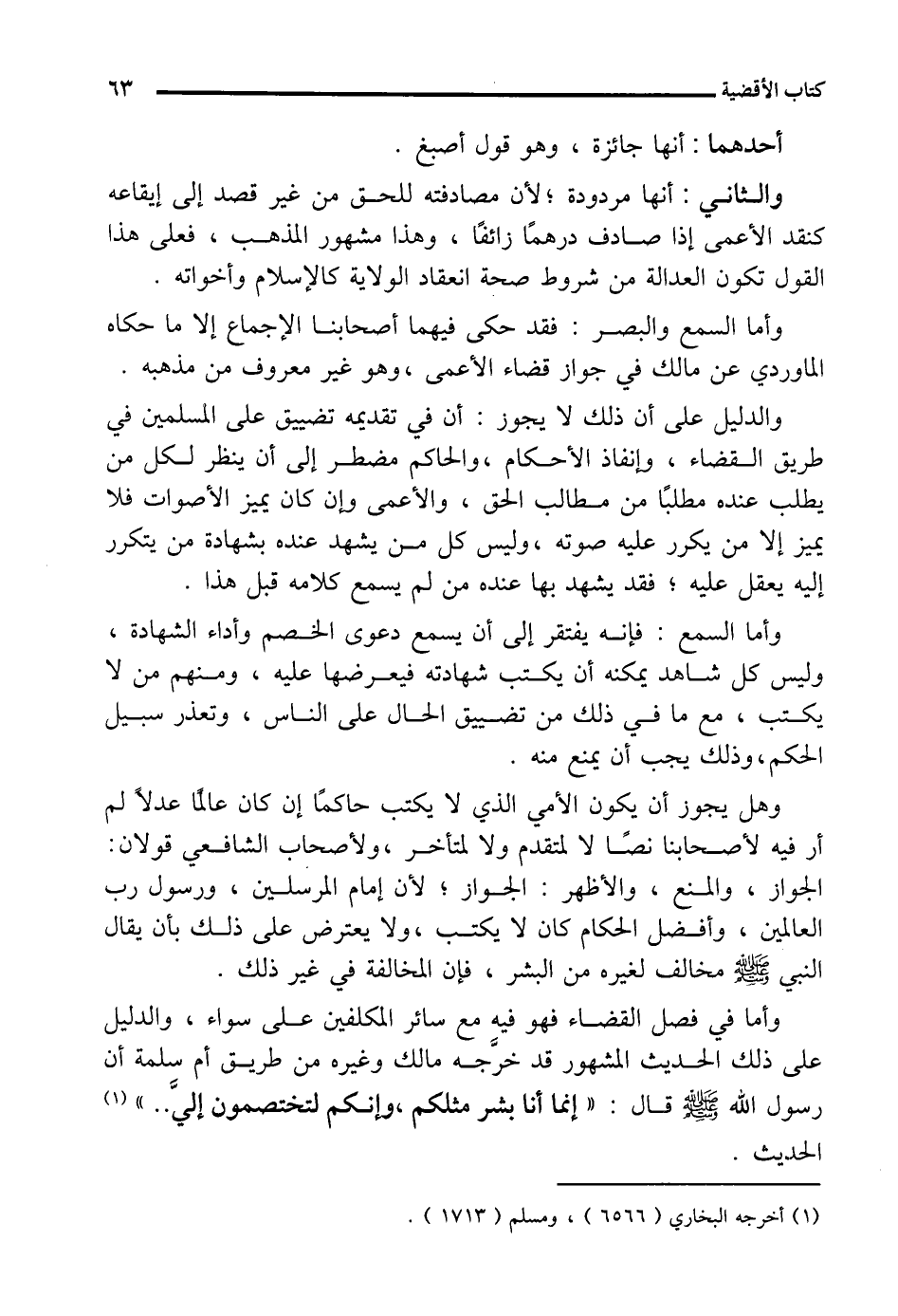 وهل يجوز أن يكون الأمي الذي لا يكتب حاكمًا إن كان عالمًا عدلًا لم أر فيه لأصحابنا نصًا لا لمتقدم ولا لمتأخر، ولأصحاب الشافعي قولان: الجواز، والمنع، والأظهر: الجواز؛ لأن إمام المرسلين، ورسول رب العالمين، وأفضل الحكام كان لا يكتب، ولا يعترض على ذلك بأن يقال النبي - صلى الله عليه وسلم - مخالف لغيره من البشر، فإن المخالفة في غير ذلك.