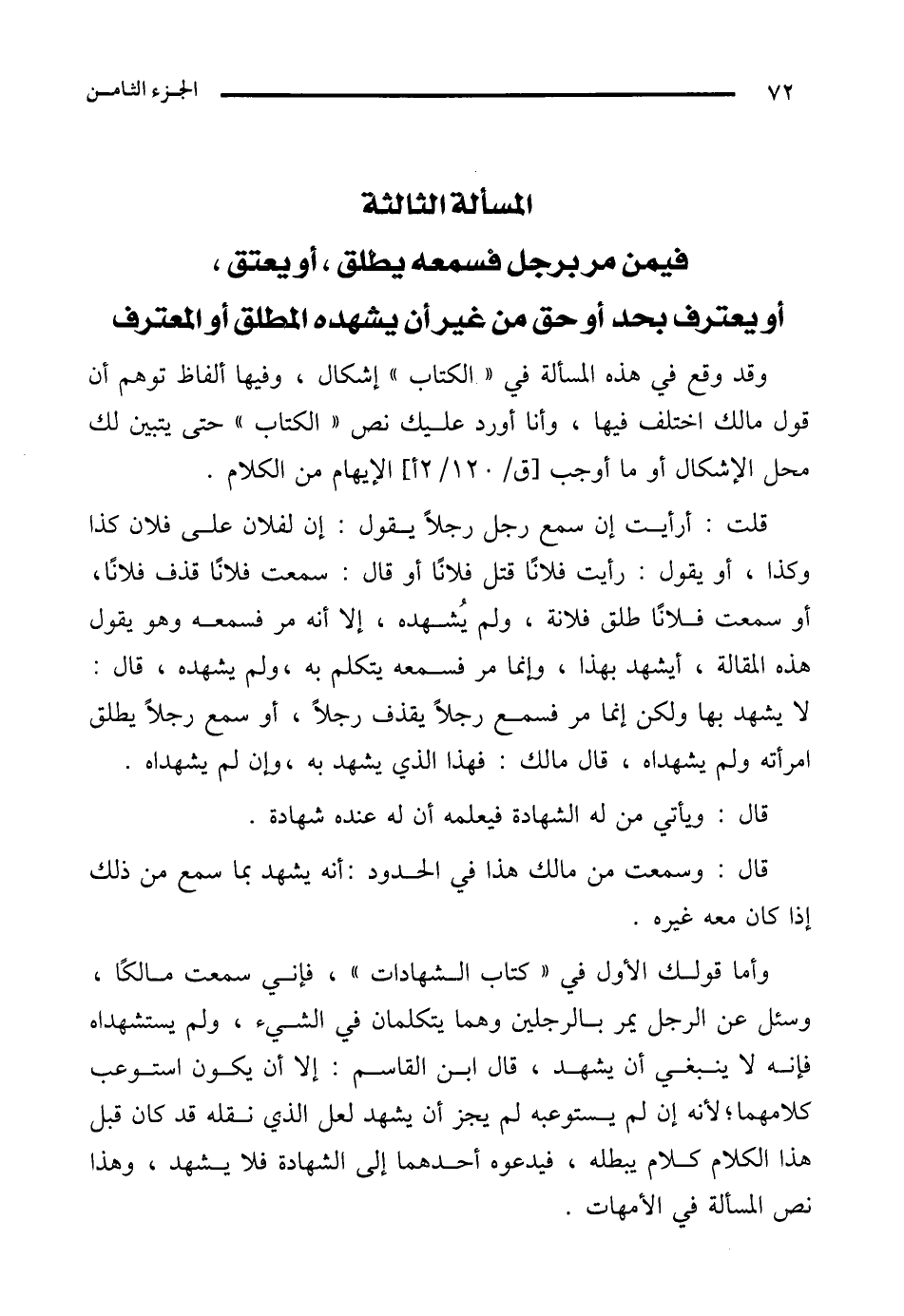 وأما قولك الأول في "كتاب الشهادات"، فإني سمعت مالكًا، وسئل عن الرجل يمر بالرجلين وهما يتكلمان في الشيء، ولم يستشهداه فإنه لا ينبغي أن يشهد، قال ابن القاسم: إلا أن يكون استوعب كلامهما؛ لأنه إن لم يستوعبه لم يجز أن يشهد لعل الذي نقله قد كان قبل هذا الكلام كلام يبطله، فيدعوه أحدهما إلى الشهادة فلا يشهد، وهذا نص المسألة في الأمهات.