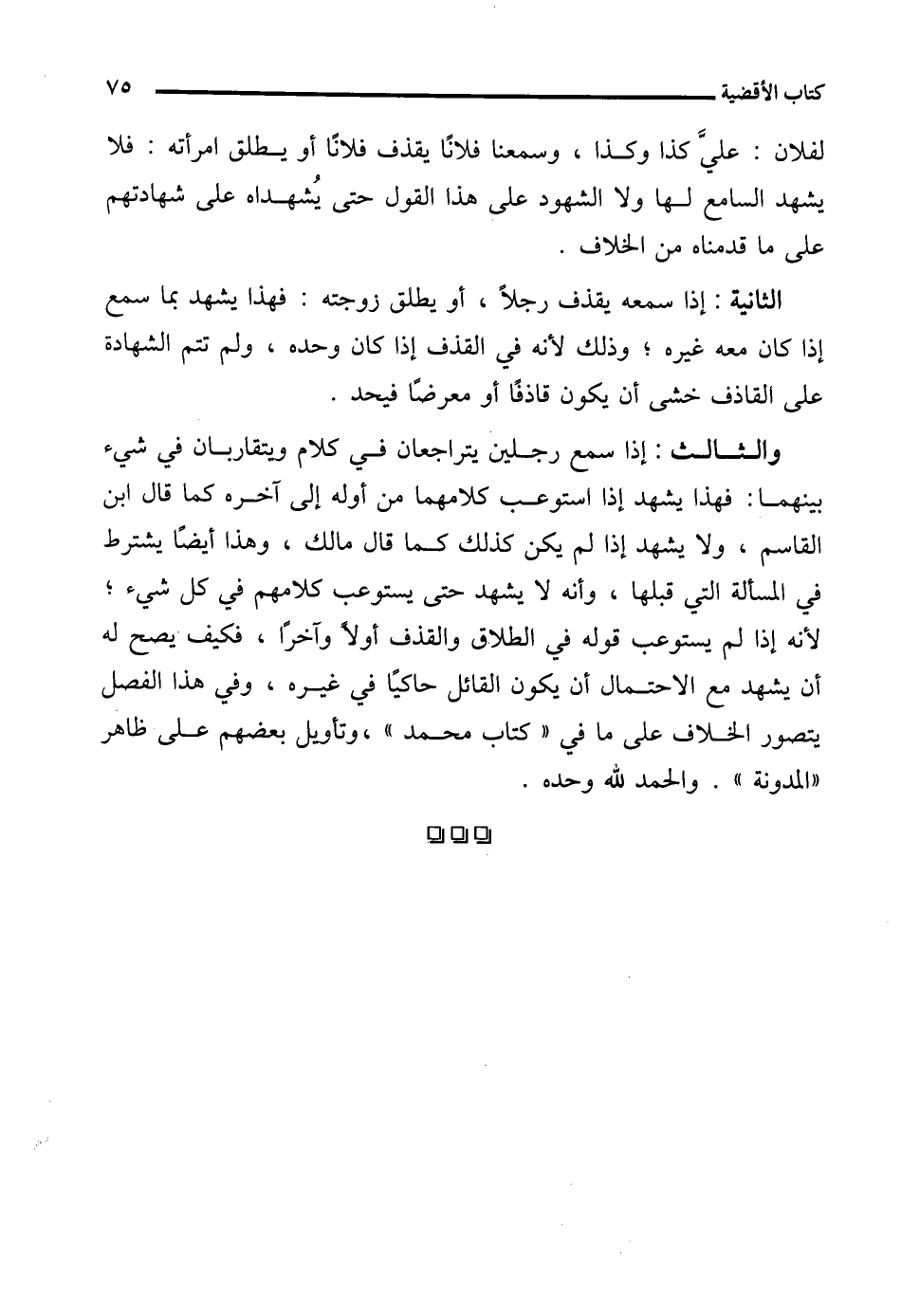والثالث: إذا سمع رجلين يتراجعان في كلام ويتقاربان في شيء بينهما: فهذا يشهد إذا استوعب كلامهما من أوله إلى آخره كما قال ابن القاسم، ولا يشهد إذا لم يكن كذلك كما قال مالك، وهذا أيضًا يشترط في المسألة التي قبلها، وأنه لا يشهد حتى يستوعب كلامهم في كل شيء؛ لأنه إذا لم يستوعب قوله في الطلاق والقذف أولًا وآخرًا، فكيف يصح له أن يشهد مع الاحتمال أن يكون القائل حاكيًا في غيره، وفي هذا الفصل يتصور الخلاف على ما في "كتاب محمد"، وتأويل بعضهم على ظاهر "المدونة". والحمد لله وحده.