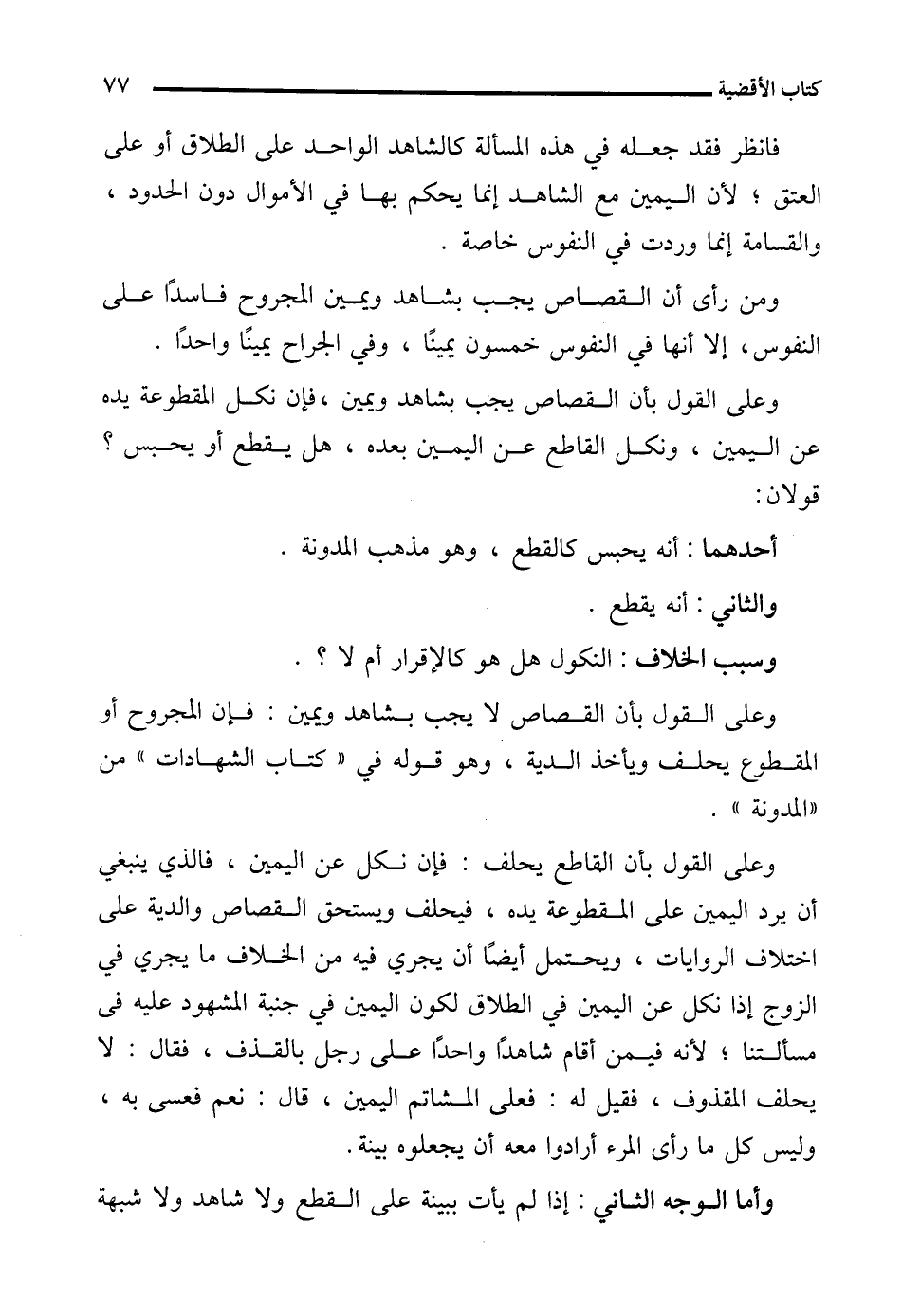 ومن رأى أن القصاص يجب بشاهد ويمين المجروح فاسدًا على النفوس، إلا أنها في النفوس خمسون يمينًا، وفي الجراح يمينًا واحدًا.