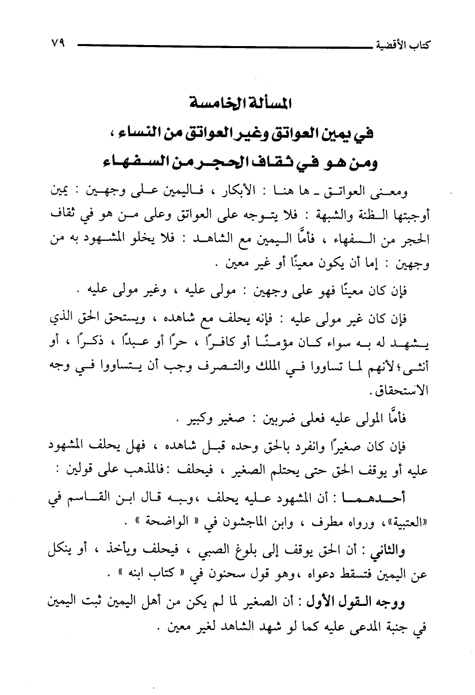 المسألة الخامسة في يمين العواتق وغير العواتق من النساء، ومن هو في ثقاف الحجر من السفهاء