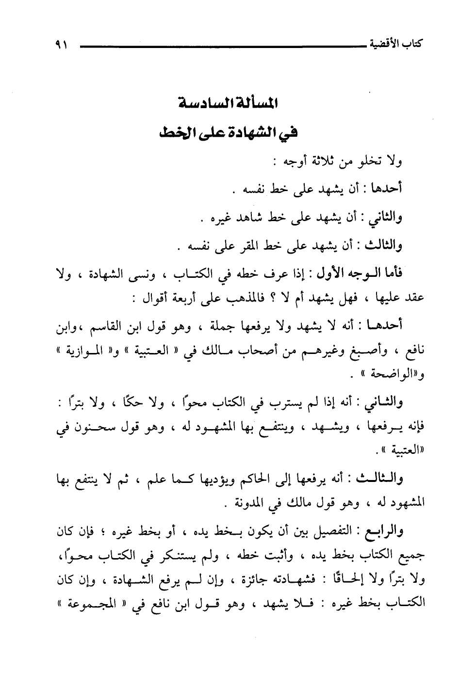والرابع: التفصيل بين أن يكون بخط يده، أو بخط غيره؛ فإن كان جميع الكتاب بخط يده، وأثبت خطه، ولم يستنكر في الكتاب محوًا، ولا بترًا ولا إلحاقًا: فشهادته جائزة، وإن لم يرفع الشهادة، وإن كان الكتاب بخط غيره: فلا يشهد، وهو قول ابن نافع في "المجموعة"