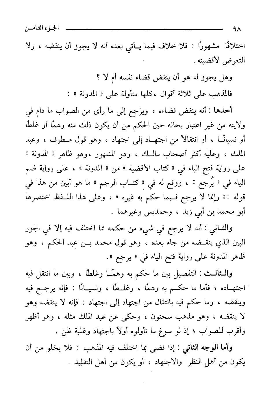 أحدها: أنه ينقض قضاءه، ويرجع إلى ما رأى من الصواب ما دام في ولايته من غير اعتبار بحاله حين الحكم من أن يكون ذلك منه وهمًا أو غلطًا أو نسيانًا، أو انتقالًا من اجتهاد إلى اجتهاد، وهو قول مطرف، وعبد الملك، وعليه أكثر أصحاب مالك، وهو المشهور، وهو ظاهر "المدونة" على رواية فتح الياء في "كتاب الأقضية" من "المدونة"، على رواية ضم الياء في "يُرجع"، ووقع له في "كتاب الرجم" ما هو أبين من هذا في قوله: "وإنما لا يرجع فيما حكم به غيره"، وعلى هذا اللفظ اختصرها أبو محمد بن أبي زيد، وحمديس وغيرهما.