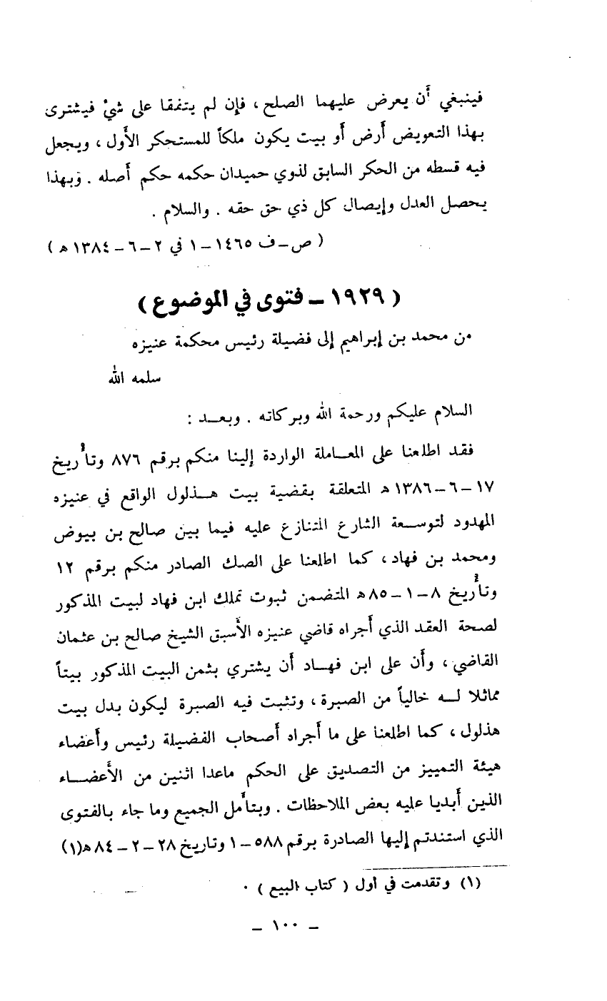 من محمد بن إبراهيم إلى فضيلة رئيس محكمة عنيزة
