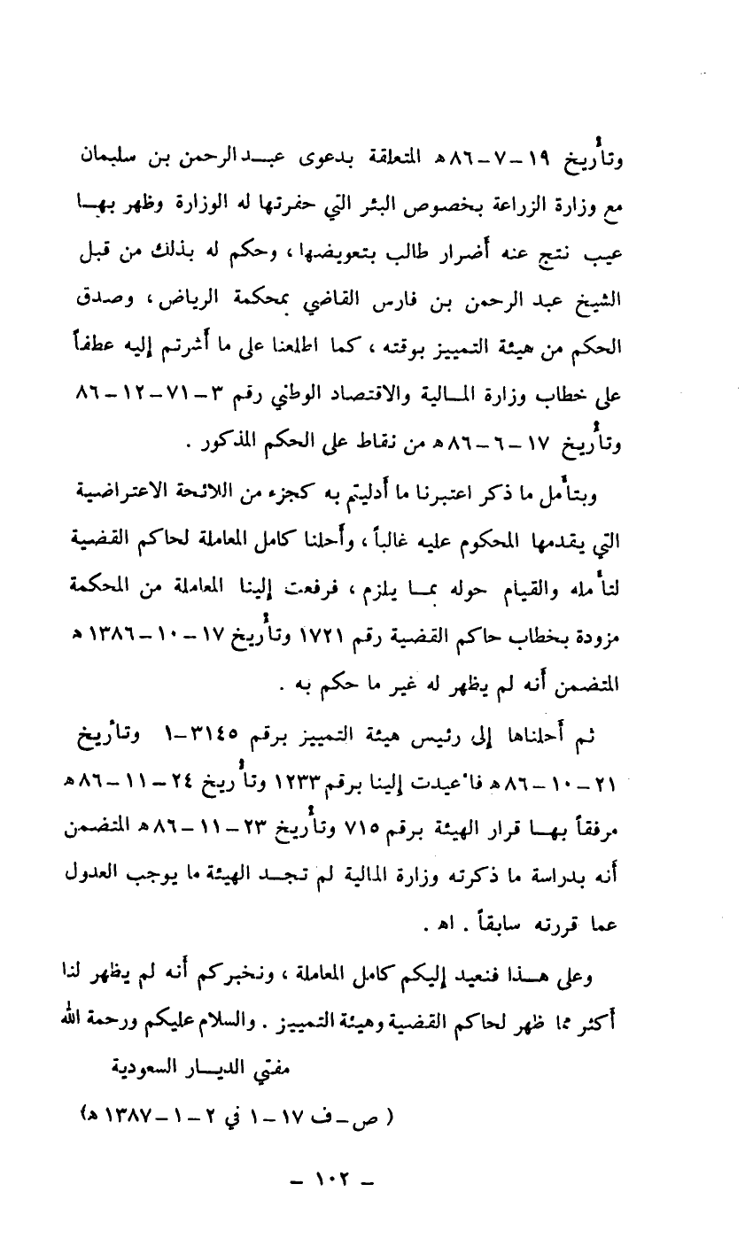 وتاريخ 19/7/1386هـ المتعلقة بدعوى عبد الرحمن بن سليمان مع وزارة الزراعة بخصوص البئر التي حفرتها له الوزارة وظهر بها عيب نتيج عنه أضرار طالب بتعويضها، وحكم له بذلك من قبل الشيخ عبد الرحمن بن فارس القاضي بمحكمة الرياض، وصدق الحقكم من هيئة التمييز بوقته، كما اطلعنا على ما أشرتم إليه عطفاً على خطاب وزارة المالية والاقتصاد الوطني رقم 3/71/12/86 وتاريخ 17/6/86هـ من نقاط على الحكم المذكور.