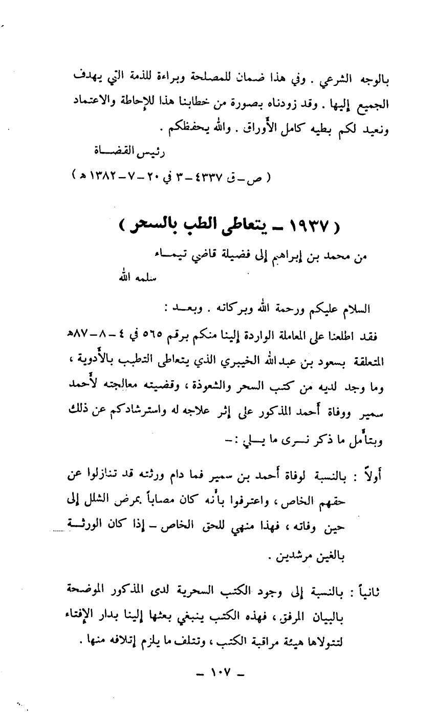 فقد اطلعنا على المعاملة الواردة إلينا منكم برقم 565 في 4/8/87هـ المتعلقة بسعود بن عبد الله الخيبري الذي يتعاطى التطبب بالأدوية، وما وجد لديه من كتب السحر والشعوذة، وقضيته معالجته لأحمد سمير ووفاة أحمد المذكور على إثر علاجه له واسترشادكم عن ذلك وبتأمل ما ذكر نرى ما يلي: ـ