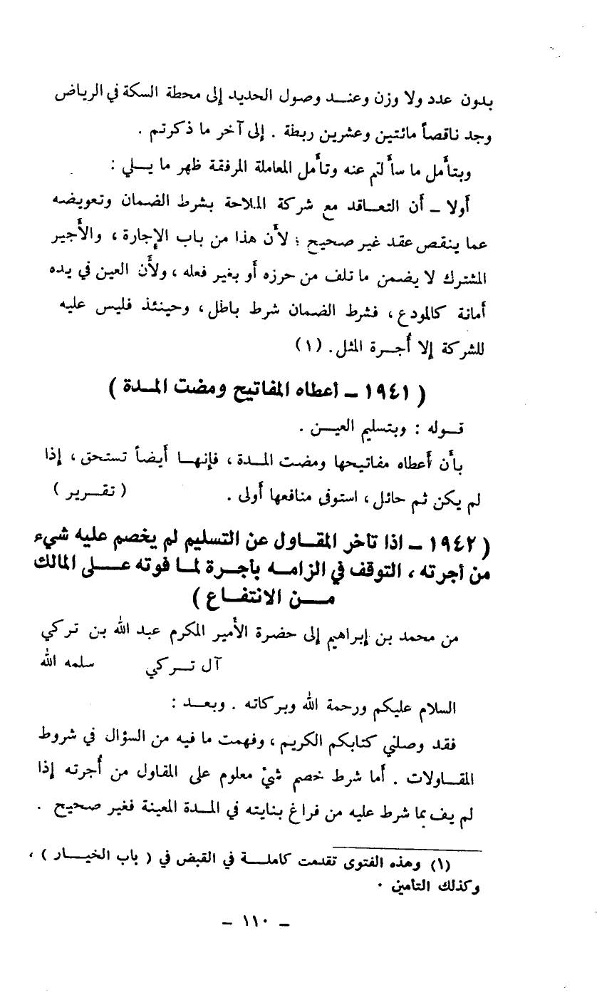 فقد وصلني كتابكم الكريم، وفهمت ما فيه من السؤال في شروط المقاولات. أما شرط خصم شيء معلوم على المقاول من أجرته إذا لم يف بما شرط عليه من فراغ بنايته في المدة المعينة فغير صحيح.