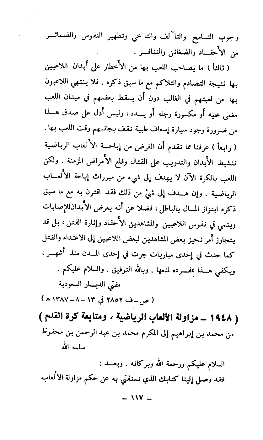 (رابعاً) عرفنا مما تقدم أن الغرض من إباحة الألعاب الرياضية تنشيط الأبدان والتدريب على القتال وقلع الأمراض المزمنة. ولكن اللعب بالكرة الآن لا يهدف إلى شيء من ذلك فقد اقترن به مع ما سبق ذكره ابتزاز المال بالباطل، فضلاً عن أنه يعرض الأبدان للإصابات وينمي في نفوس اللاعبين والمشاهدين الأحقاد وإثارة الفتن، بل قد يتجاوز أمر تحيز بعض المشاهدين لبعض اللاعبين إلى الاعتداء والقتل كما حدث في إحدى مباريات جرت في إحدى المدن منذ أشهر ويكفي هذا بمفرده لمنعها. وبالله التوفيق. والسلام عليكم. ... مفتي الديار السعودية