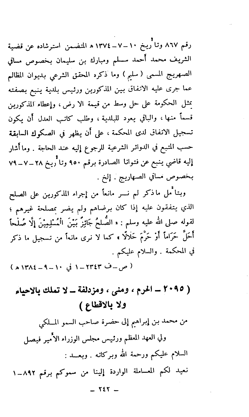 رقم 867 وتاريخ 10-7-1374هـ المتضمن استرشاده عن قضية الشريف محمد أحمد سلم ومبارك بن سليمان بخصوص مساقي الصهريج المسمى (سليم) وما ذكره المحقق الشرعي بديوان المظالم عما جرى عليه الاتفاق بين المذكورين ورئيس بلدية ينبع بصفته يمثل الحكومة على حل وسط من قيمة الأرض، وإعطاء المذكورين قسماً منها، والباقي يعود للبلدية، وطلب كاتب العدل أن يكون تسجيل الاتفاق لدى المحكمة، على أن يظهر في الصكوك السابقة حسب المتبع في الدوائر الشرعية للرجوع إليه عند الحاجة. وما أشار إليه قاضي ينبع عن فتوانا الصادرة برقم 950 وتاريخ 28-7-79 بخصوص مساقي الصهاريج. إلخ.