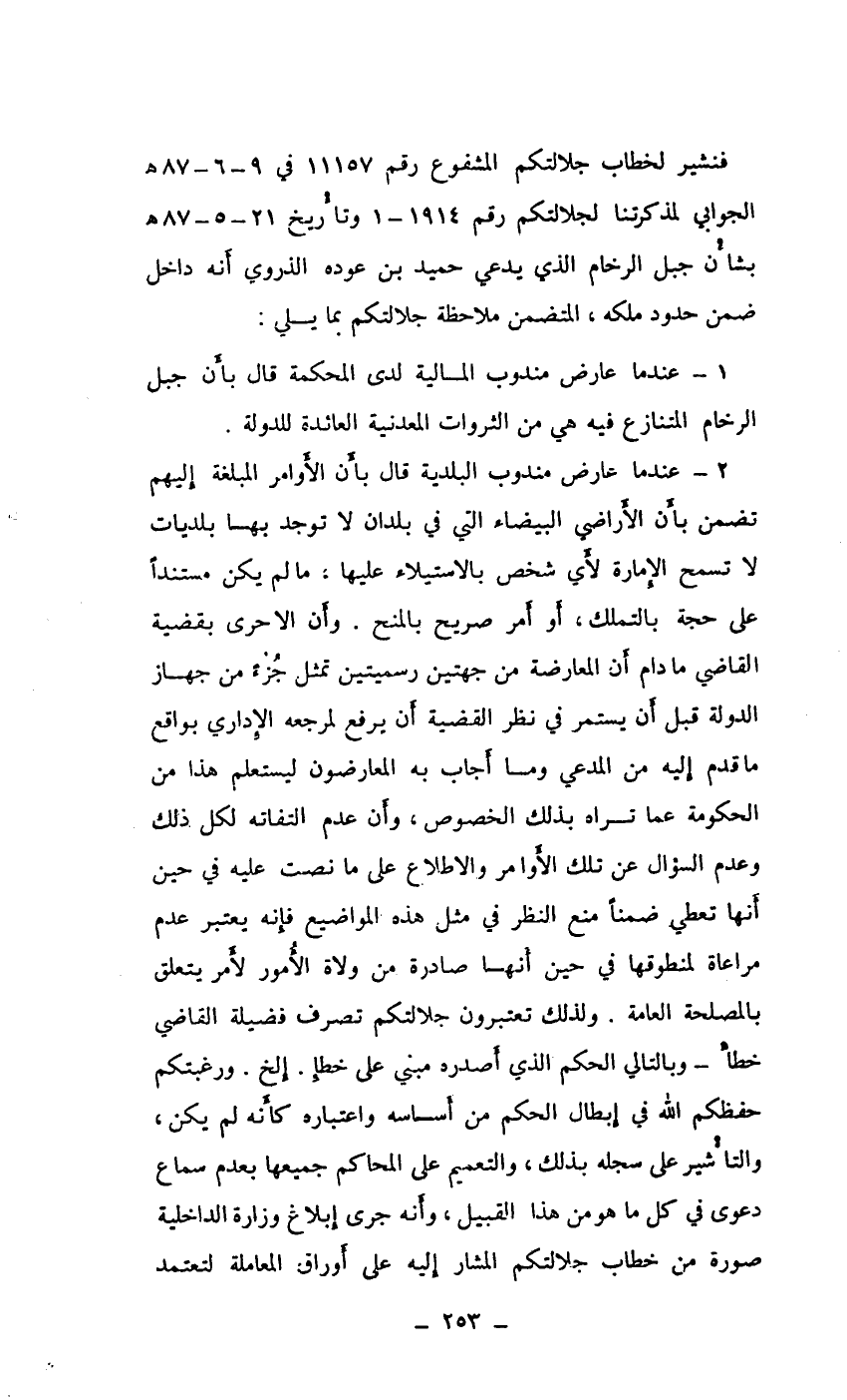 2 ـ عندما عارض مندوب البلدية قال بأن الأوامر المبلغة إليهم تضمن بأن الأراضي البيضاء التي في بلدان لا توجد بها بلديات لا تسمح الإمارة لأي شخص بالاستيلاء عليها، مالم يكن مستنداً على حجة بالتملك، أو أمر صريح بالمنح. وأن الاحرى بقضية القاضي ما دام أن المعارضة من جهتين رسميتين تمثل جزء من جهاز الدولة قبل أن يستمر في نظر القضية أن يرفع لمرجعه الإداري بواقع ما قدم إليه من المدعي وما أجاب به المعارضون ليستعلم هذا من الحكومة عما تراه بذلك الخصوص، وأن عدم التفاته لكل ذلك وعدم السؤال عن تلك الأوامر والاطلاع على ما نصت عليه في حين أنها تعطي ضمناً منع النظر في مثل هذه المواضيع فإنه يعتبر عدم مراعاة لمنطوقها في حين أنها صادرة من ولاة الأمور لأمر يتعلق بالمصلحة العامة. ولذلك تعتبرون جلالتكم تصرف فضيلة القاضي خطأ ـ وبالتالي الحكم الذي أصدره مبني على خطأ إلخ. ورغبتكم حفظكم الله في إبطال الحكم من أساسه واعتباره كأنه لم يكن، والتأشير على سجله بذلك، والتعميم على المحاكم جميعها بعدم سماع دعوى في كل ما هو من هذا القبيل، وأنه جرى إبلاغ وزارة الداخلية صورة من خطاب جلالتكم المشار إليه على أوراق المعاملة لتعتمد