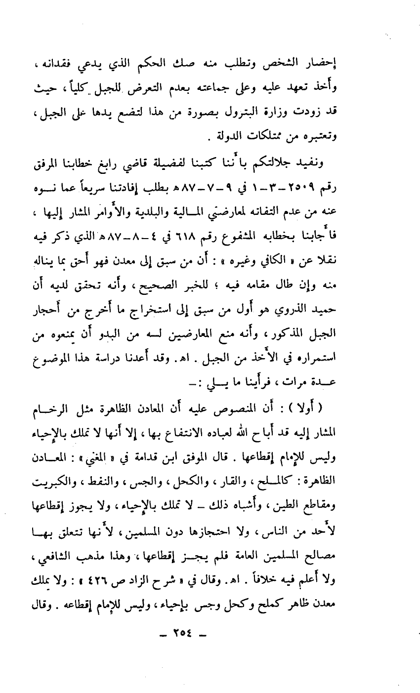 ونفيد جلالتكم بأننا كتبنا لفضيلة قاضي رابغ خطابنا المرفق رقم 2509 ـ 3-1 في 9/7/87هـ الذي ذكر فيه نقلاً عن " الكافي وغيره ": أن من سبق إلى معدن فهو أحق بما يناله منه وإن طال مقامه فيه، للخبر الصحيح، وأنه تحقق لديه أن حميد الذروي هو أول من سبق إلى استخراج ما أخرج من أ؛ جار الجبل المذكور، وأنه منع المعارضين له من البدو أن يمنعوه من استمراره في الأخذ من الجبل اهـ وقد أعدنا دراسة هذا الموضوع عدة مرات، فرأينا ما يلي: ـ