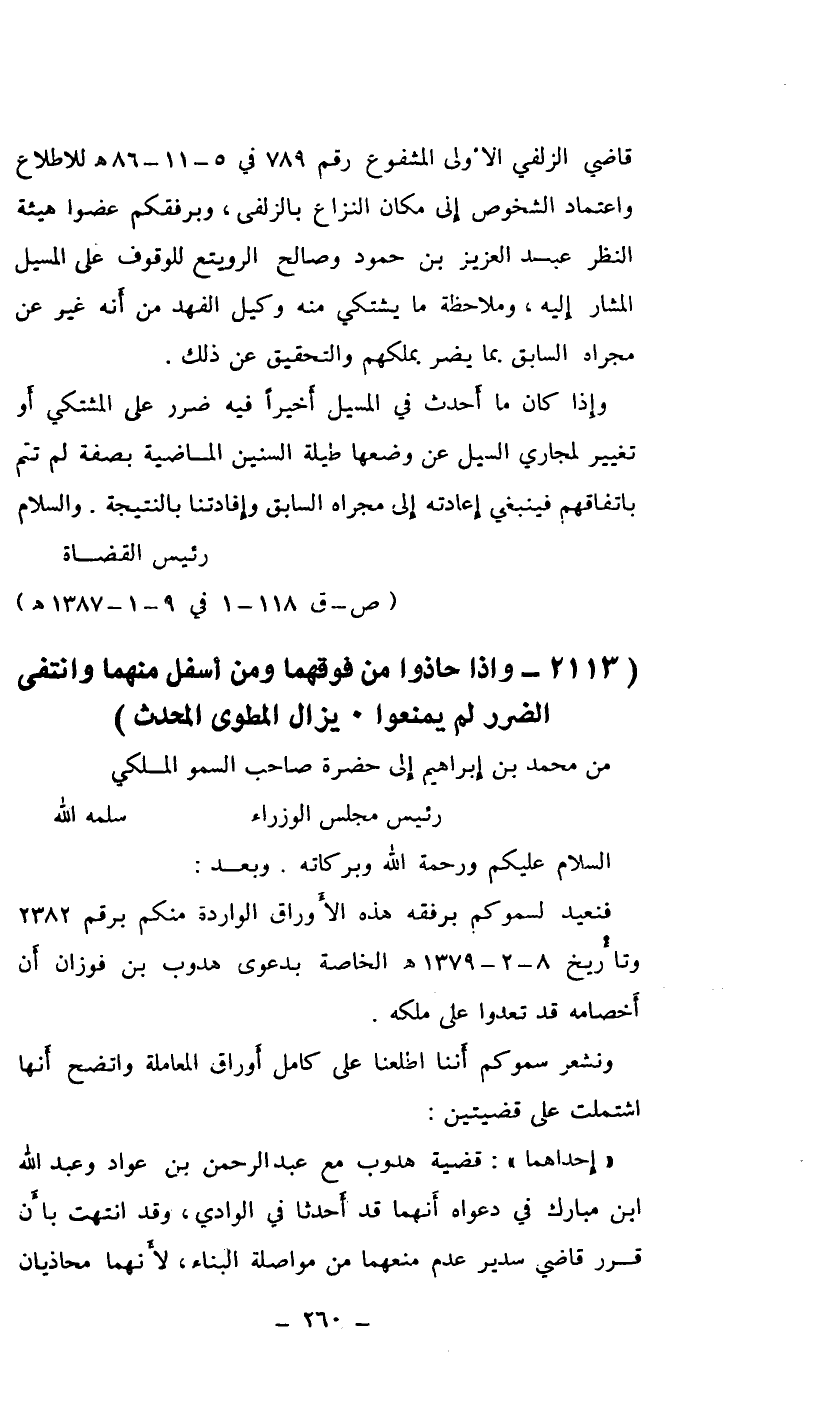 قاضي الزلفي الأولى اشفوع رقم 789 ـ في 5/11/86هـ للاطلاع واعتماد الشخوص إلى مكان النزاع بالزلفى، وبرفقكم عضوا هيئة النظر عبد العزيز بن حمود وصالح الرويتع للوقوف على المسيل المشار إليه، وملاحظة ما يشتكي منه وكيل الفهد من أنه غير عن مجراه السابق بما يضر بملكهم والتحقيق عن ذلك.