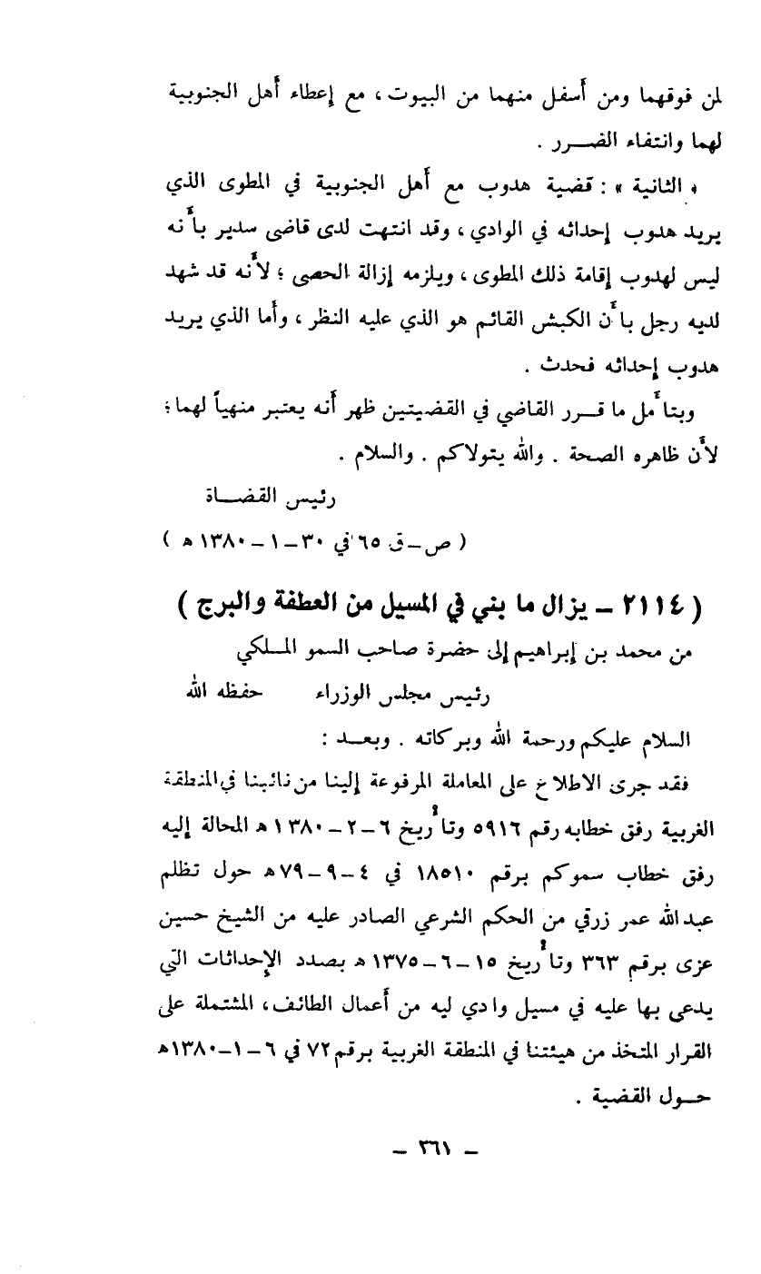 فقد جرى الاطلاع على المعاملة المرفوعة إلينا من نائبنا في المنطقة الغربية رفق خطابه رقم 5916 وتاريخ 6/2/80هـ المحالة إليه رفق خطاب سموكم برقم 18510 في 4/9/79هـ حول تظلم عبد الله عمر زرقي من الحكم الشرعي الصادر عليه من الشيخ حسين عزي برقم 363 وتاريخ 15/6/75هـ بصدد الإحداثات التي يدعى بها عليه في مسيل وادي ليه من أعمال الطائف، المشتملة على القرار المتخذ من هيئتنا في المنطقة الغربية برقم 72 في 6/1/80هـ حول القضية