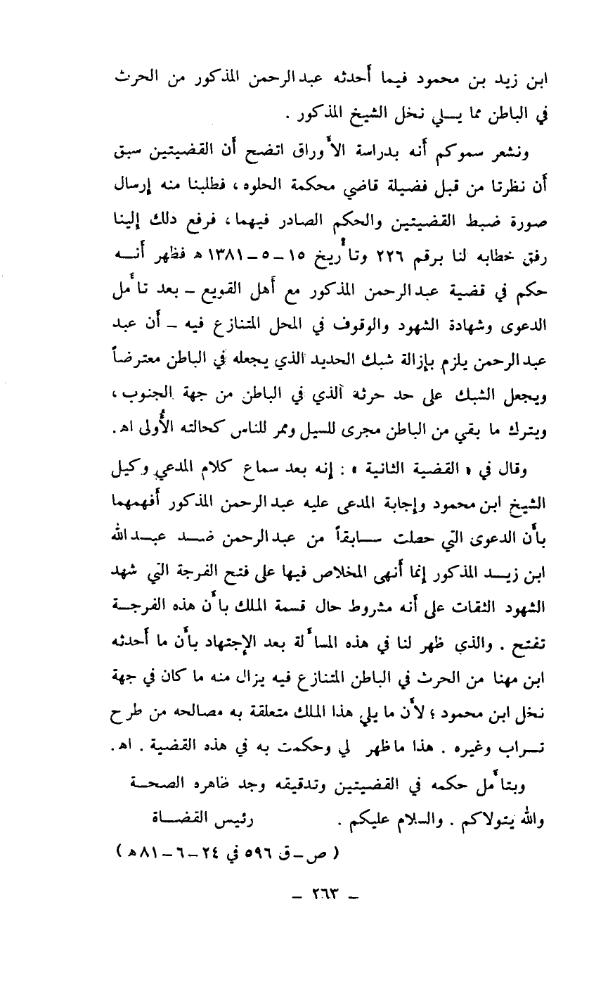 وقال في " القضية الثانية " إنه بعد سماع كلام المدعى وكيل الشيخ ابن محمود وإجابة المدعى عليه عبد الرحمن المذكور أفهمهما بأن الدعوى التي حصلت سابقاً من عبد الرحمن ضد عبد الله بن زيد المذكور إنما أنهى المخلاص فيها على فتح الفرجة التي شهد الشهود الثقات على أنه مشروط حال قسمة الملك بأن هذه الفرجة تفتح. والذي ظهر لنا في هذه المسألة بعد الإجتهاد بأن ما أحدثه ابن مهنا من الحرث في الباطن المتنازع فيه يزال منه ما كان في جهة نخل ابن محمود، لأن ما يلي هذا الملك متعلقة به مصالحه من طرح تراب وغيره. هذا ما ظهر لي وحكمت به في هذه القضية. اهـ وبتأمل حكمه في القضييتين وتدقيقه وجد ظاهره الصحة والله يتولاكم. والسلام عليكم.
