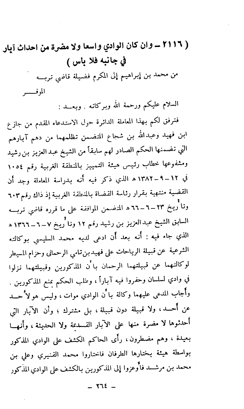 فنرفق لكم بهذا المعاملة الدائرة حول الاستدعاء المقدم من جازع ابن فهيد وعبد الله بن شجاع المتضمن تظلمهما من دهم آبارهم التي تضمنها الحكم الصادر لهم سابقاً من الشيخ عبد العزيز بن رشيد ومشفوعها خطاب رئيس هيئة التمييز بالمنطقة الغربية رقم 1054 في 12-9-1382هـ الذي ذكر فيه أنه بدراسة المعاملة وجد أن القضية منتهية بقرار رئاسة القضاء بالمنطقة الغربية إذ ذاك رقم 603 وتاريخ 23-6-66هـ المتضمن الموافقة على ما قرره قاضي تربة السابق الشيخ عبد العزيز بن رشيد رقم 12 وتاريخ 7-6-1366هـ الذي جاء فيه: أنه بعد أن ادعي لديه محمد السلسي بوكالته الشرعية عن قبيلة الرياحات على فهيد بن تامي الرحماني بوكالته الشرعية عن قبيلة الرياحات على فهيد بن تامي الرحماني وحزام المسيطر لوكالتهما عن قبيلتهما الرحمان بأن المذكورين وقبيلتهما نزلوا في وادي لسلسان وحفروا فيه آباراً، وطلب الحكم بمنع المذكورين وأجاب المدعي عليهما وكالة بأن الوادي موات، وليس هو لأحد عن أحد، ولا قبيلة دون قبيلة، بل مشترك، وأن الآبار التي احدثوها لا مضرة منها على الآبار القديمة ولا الحديثة، وأنها بعيدة، وهم مضطرون رأى الحاكم الكشف على الوادي المذكور بواسطة هيئة يختارها الطرفان فاختاروا محمد القنيري وعلي بن محمد بن مرشد فأوعزوا إلى المذكورين بالكشف على الوادي المذكور