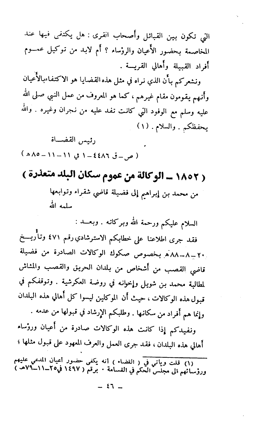 من محمد بن إبراهيم إلى فضيلة قاضي شقراء وتوابعها