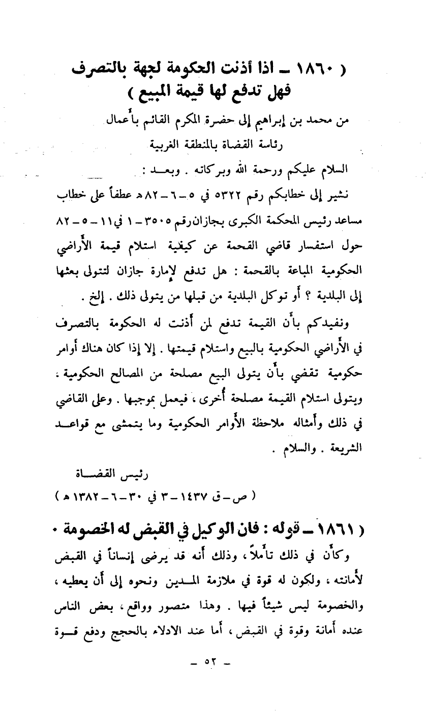 من محمد بن إبراهيم إلى حضرة المكرم القائم بأعمال رئاسة القضاة بالمنطقة الغربية