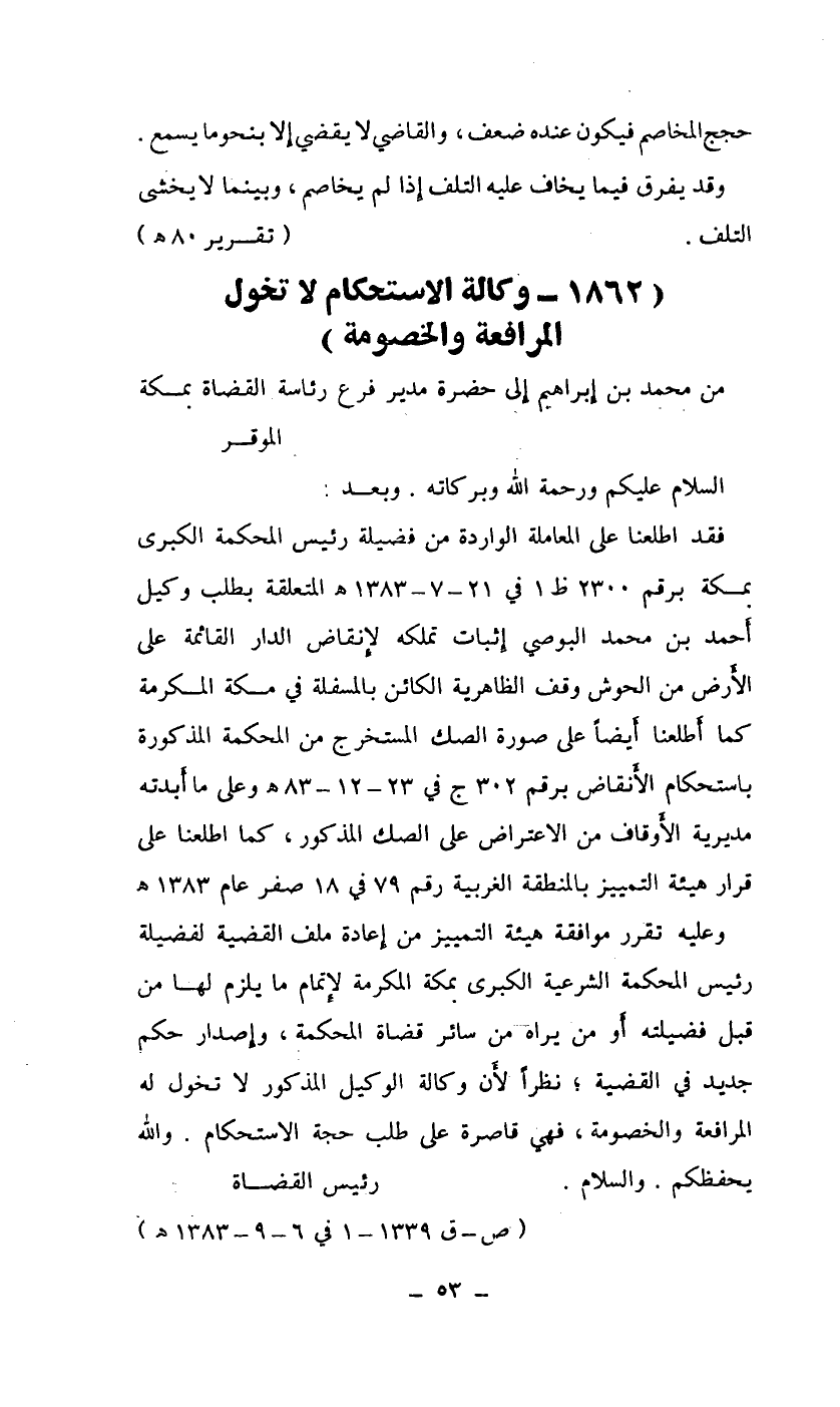 فقد اطلعنا على المعاملة الواردة من فضيلة رئيس المحكمة الكبرى بمكة رقم 2300ظ1 في 21-7-1383هـ المتعلقة بطلب وكيل أحمد بن محمد البوصي إثبات تملكه لإنقاض الدار القائمة على الأرض من الحوش وقف الظاهرية الكائن بالمسفلة في مكة المكرمة كما اطلعنا أيضاً على صورة الصك المستخرج من المحكمة المذكورة باستحكام الأنقاض برقم 302ج في 23-12-83هـ وعلى ما أبدته مديرية الأوقاف من الاعتراض على الصك المذكور كما اطلعنا على قرار هيئة التمييز بالمنطقة الغربية رقم 79 في 18 صفر 1383هـ وعليه تقرر موافقة هيئة التمييز من إعادة ملف القضية لفضيلة رئيس المحكمة الشرعية الكبرى بمكة المكرمة لإتمام ما يلزم لها من قبل فضيلته أو من يراه من سائر قضاة المحكمة، وإصدار حكم جديد في القضية، نظراً لأن وكالة الوكيل المذكور لا تخول له المرافعة والخصومة، فهي قاصرة على طلب حجة الاستحكام. والله يحفظكم. والسلام.