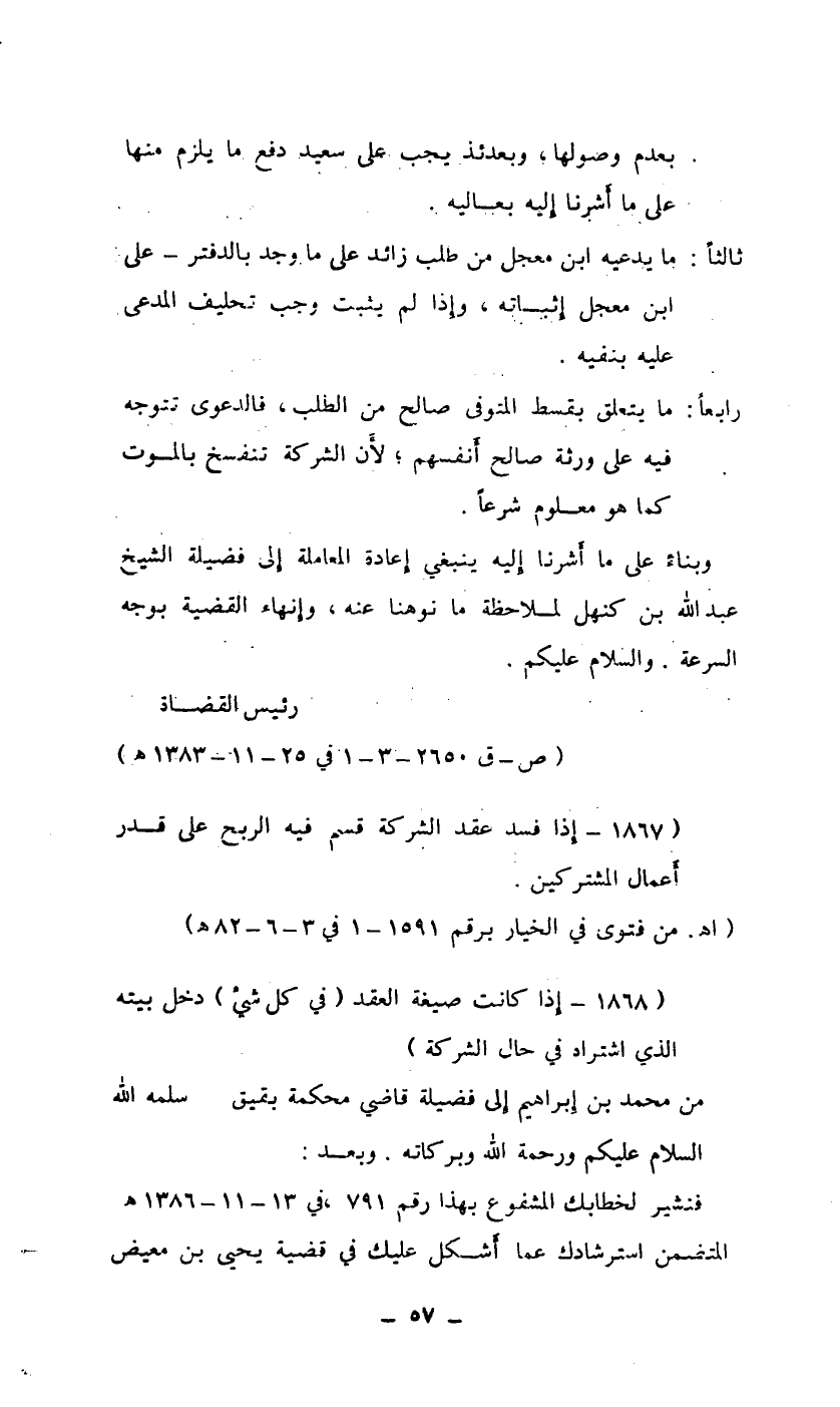 رابعاً: ما يتعلق بقسط المتوفى صالح من الطلب، فالدعوى تتوجه فيه على ورثة صالح أنفسهم، لأن الشركة تنفسخ بالموت كما هو معلوم شرعاً.