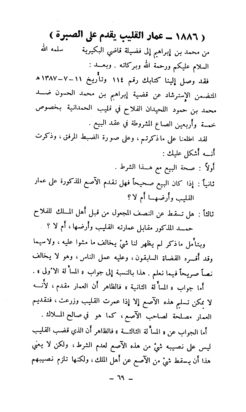 فقد وصل إلينا كتابك رقم 114 وتاريخ 11-7-1387هـ المتضمن الاسترشاد عن قضية إبراهيم بن محمد الحسون ضد محمد بن حمود اللحيدان الفلاح في قلب الحمدانية بخصوص خمسة وأربعين الصاع المشروطة في عقد البيع.