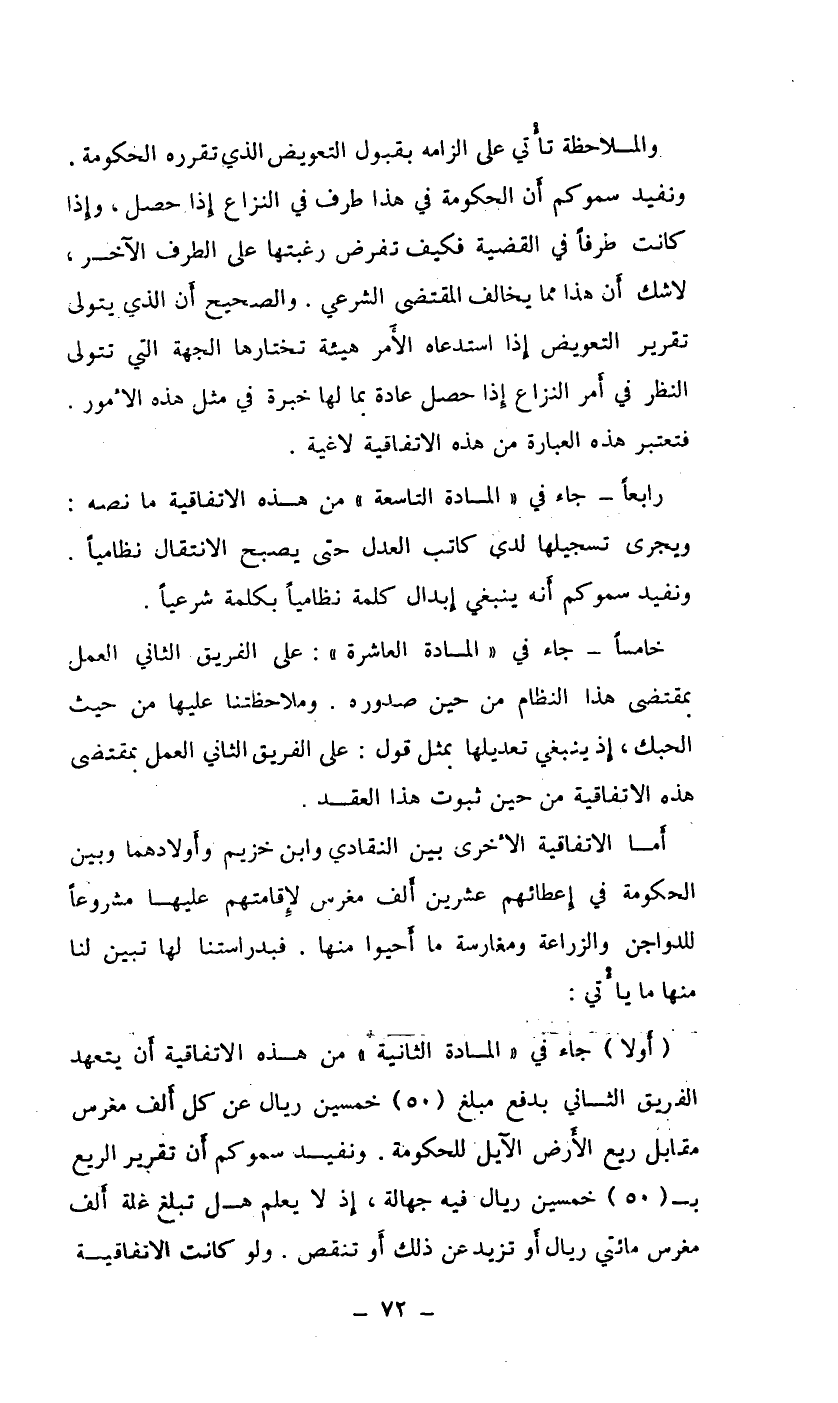 خامساً: جاء في المادة العاشرة: على الفريق الثاني العمل بمقتضى هذا النظام من حين صدوره. وملاحظتنا عليها من حيث الحبك، إذ ينبغي تعديلها بمثل قول: على الفريق الثاني العمل بمقتضى هذه الاتفاقية من حين ثبوت هذا العقد.