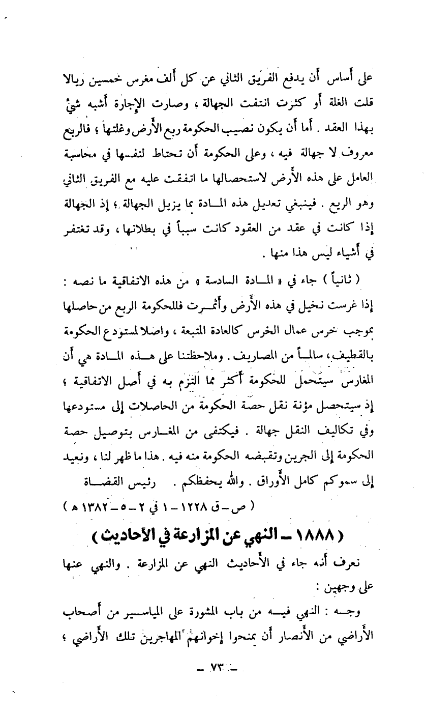 على أساس أن يدفع الفريق الثاني عن كل ألف مغرس خمسين ريالا قلت الغلة أو كثرت انتفت الجهالة، وصارت الإجارة أشبه شيء بهذا العقد. أما أن يكون نصيب الحكومة ربع الأرض وغلتها، فالربع معروف لا جهالة فيه، وعلى الحكومة أن تحتاط لنفسها في محاسبة العامل على هذه الأرض لاستحصالها ما اتفقت عليه مع الفريق الثاني وهو الربع. فينبغي تعديل هذه المادة بما يزيل الجهالة، إذ الجهالة إذا كانت في عقد من العقود كانت سبباً في بطلانها، وقد تغتفر في أشياء ليس هذا منها.