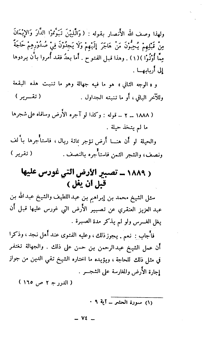 فأجاب: نعم. ويجوز ذلك، وعليه الفتوى عند أهل نجد، وذكرا أن عمل الشيخ عبد الرحمن بن حسن على ذلك. والجهالة تغتفر في مثل ذلك للحاجة، ويؤيده ما اختاره الشيخ تقي الدين من جواز إجارة الأرض والمغارسة على الشجر.