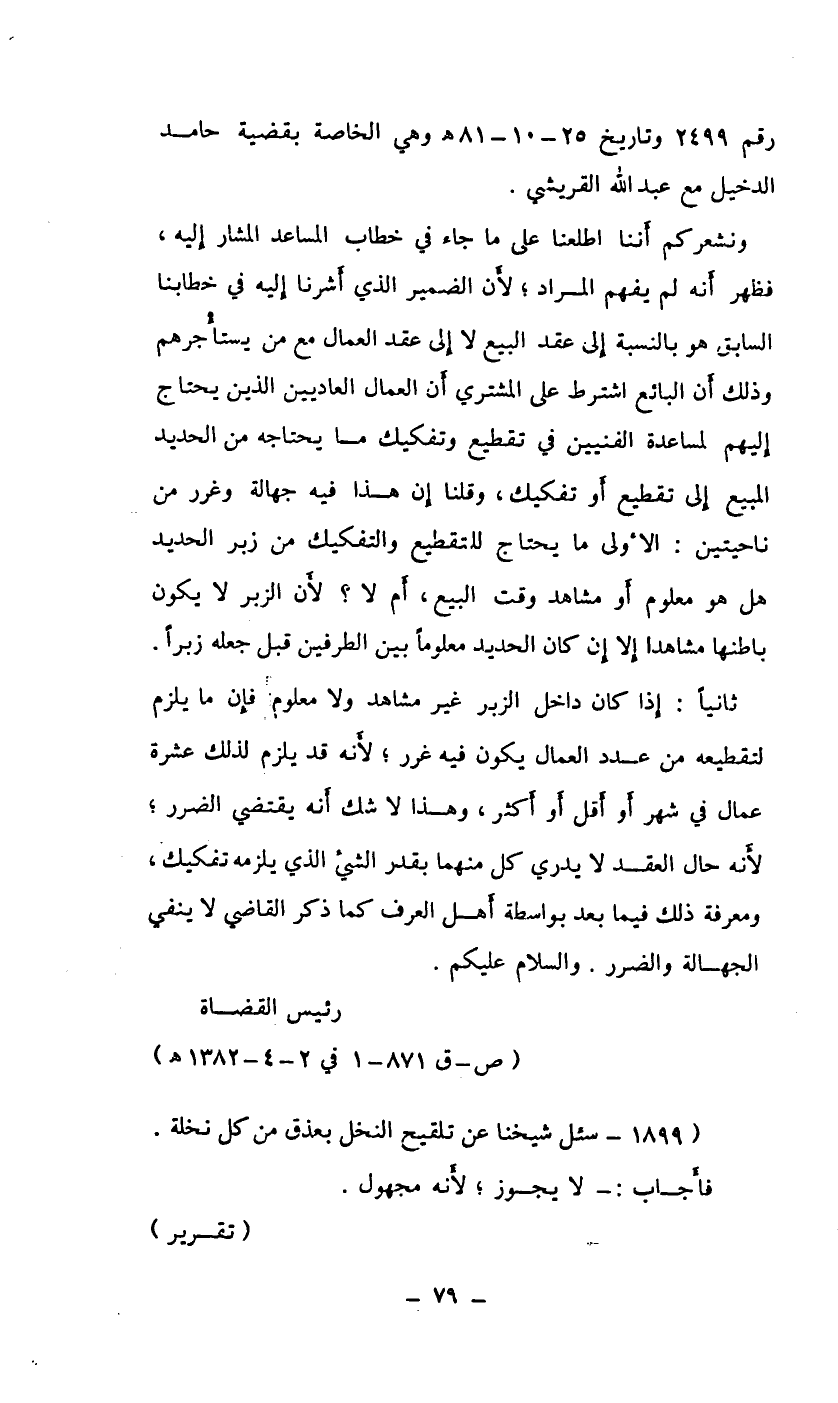ونشعركم أننا اطلعنا على ما جاء في خطاب المساعد المشار إليه فظهر أنه لم يفهم المراد، لأن الضمير الذي أشرنا إليه في خطابنا السابق هو بالنسبة إلى عقد البيع لا إلى عقد العمال مع من يستأجرهم وذلك أن البائع اشترط على المشتري أن العمال العاديين الذين لا يحتاج إليهم لمساعدة الفنيين في تقطيع وتفكيك ما يحتاجه من الحديد المبيع إلى تقطيع أو تفكيك، وقلنا إن هذا فيه جهالة وغرر من ناحيتين: الأولى ما يحتاج للتقطيع والتفكيك من زبر الحديد هل هو معلوم أو مشاهد وقت البيع، أم لا؟ لأن الزبر لا يكون باطنها مشاهداً إلا إن كان الحديد معلوماً بين الطرفين قبل جعله زبراً.