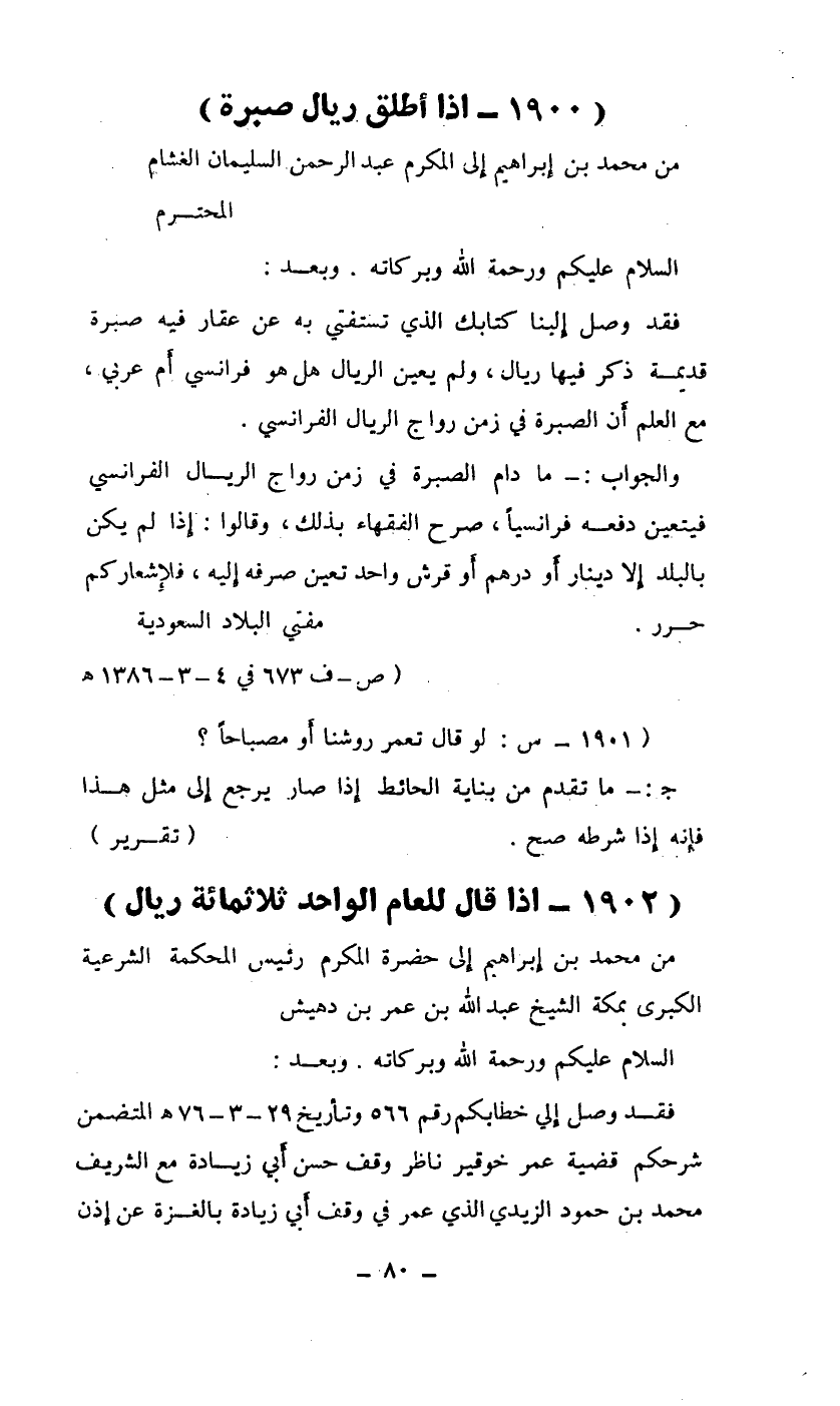 فقد وصل إلينا كتابك الذي تستفتي به عن عقا فيه صبرة قديمة ذكر فيها ريال، ولم يعين الريال هل هو فرانسي أم عربي، مع العلم أن الصبرة في زمن رواج الريال الفرانسي.