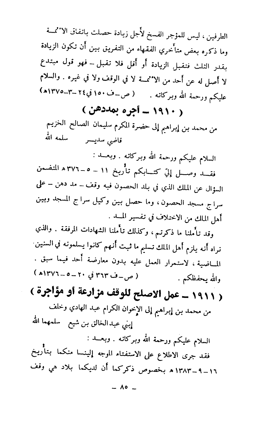 فقد وصل إليّ كتابكم تاريخ 11-5-376هـ المتضمن السؤال عن الملك الذي في بلد الحصون فيه وقف -مد دهن- على سراج مسجد الحصون، وما حصل بين وكيل سراج المسجد وبين أهل الملك من الاختلاف في تفسير المد.