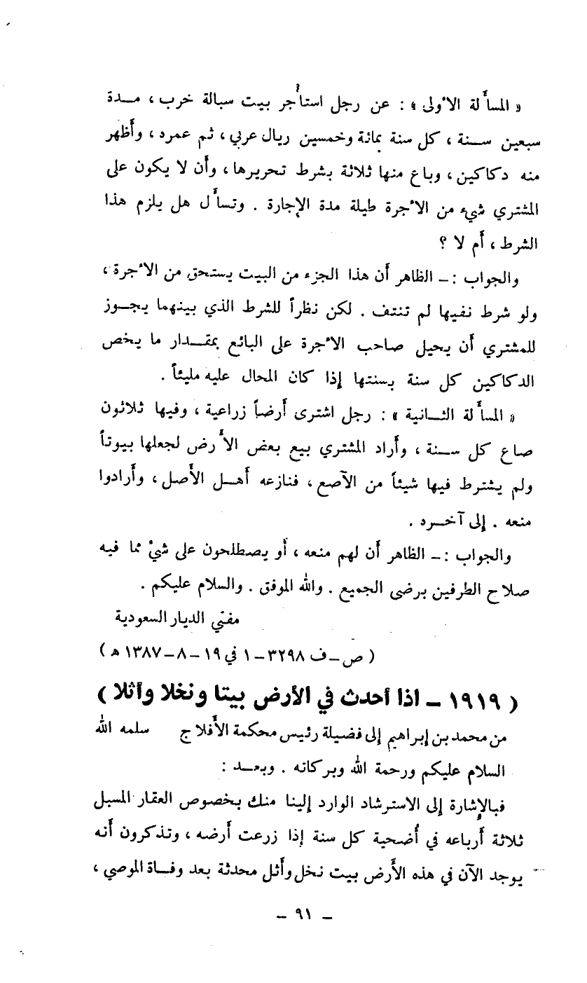 فبالإشارة إلى الاسترشاد الوارد إلينا منك بخصوص العقار المسيل ثلاثة أرباعه في أضحية كل سنة إذا زرعت أرضه، وتذكرون أنه يوجد الآن في هذه الأرض بيت نخل وأثل محدثة بعد وفاة الموصي،