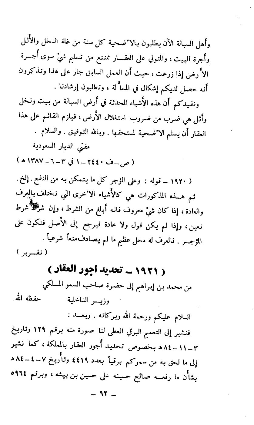 فنشير إلى التعميم البرقي المعطى لنا صورة منه برقم 129 وتاريخ 3-11-84هـ بخصوص تحديد أُجور العقار بالمملكة، كما نشير إلى ما لحق به من سموكم برقياً بعدد 4419 وتاريخ 7-4-84هـ بشأن ما رفعه صالح حسينه على حسين بن بيشة، وبرقم 5964