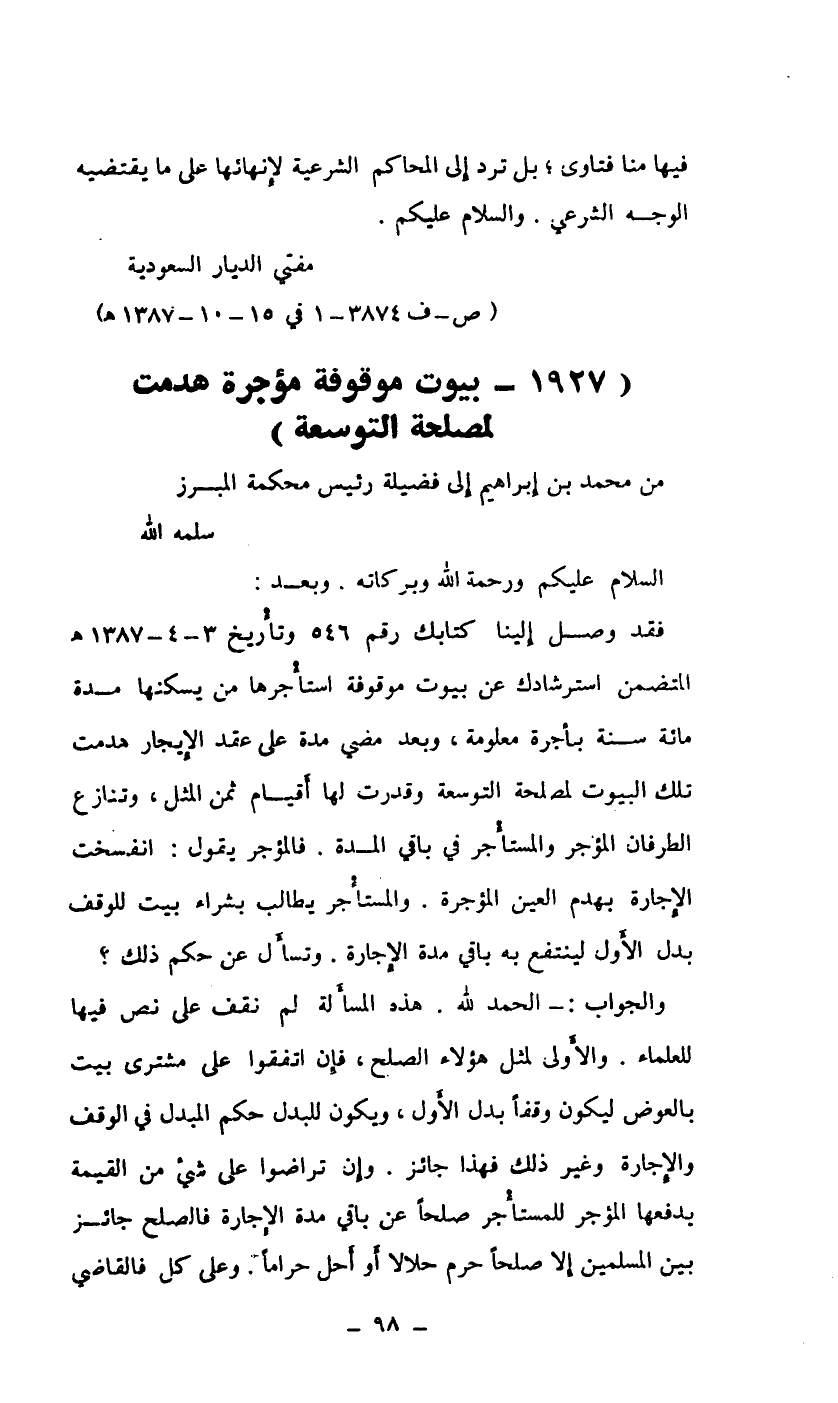 فقد وصل إلينا كتابك رقم 546 وتاريخ 3-4-1387هـ المتضمن استرشادك عن بيوت موقوفة استأجرها من يسكنها مدة مائة سنة بأجرة معلومة، وبعد مضي مدة على عقد الإيجار هدمت تلك البيوت لمصلحة التوسعة وقدت لها أقيام ثمن المثل، وتنازع الطرفان المؤجر والمستأجر في باقي المدة. فالمؤجر يقول: انفسخت الإجارة بهدم العين المؤجرة. والمستأجر يطالب بشراء بيت للوقف بدل الأول لينتفع به باقي مدة الإجارة. وتسأل عن حكم ذلك؟