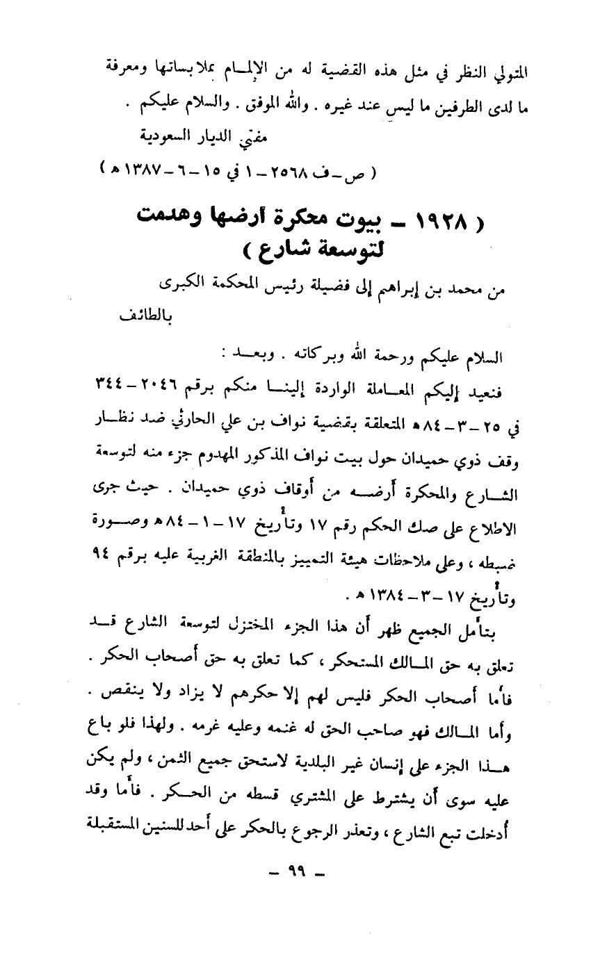 فنعيد إليكم المعاملة الواردة إلينا منكم برقم 2046-344 في 25-3-84هـ المتعلقة بقضية نواف بن علي الحارثي ضد نظار وقف ذوي حميدان حول بيت نواف المذكور المهدوم جزء منه لتوسعة الشارع والمحكرة أرضه من أوقاف ذوي حميدان. حيث جرى الاطلاع على صك الحكم رقم 17 وتاريخ 17-1-84هـ وصورة ضبطه، وعلى ملاحظات هيئة التمييز بالمنطقة الغربية عليه برقم 94 وتاريخ 17-3-1384هـ.