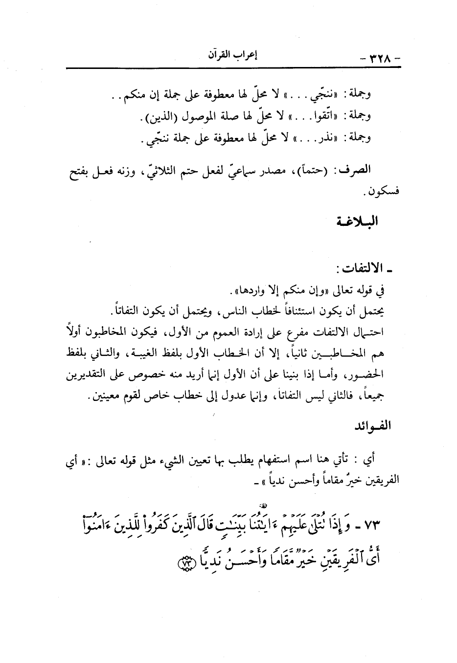 1- فن التوهيم: في قوله تعالى «أَلَّا تُشْرِكُوا بِهِ شَيْئاً» وهو أن يأتي المتكلم بكلمة يوهم ما بعدها من الكلام أن المتكلم أراد تصحيفها، وهو يريد غير ذلك. فإن ظاهر الكلام في الآية الكريمة يدل على تحريم نفي الشرك، وملزومه تحليل الشرك، وهذا محال، وخلاف المعنى المراد، والتأويل الذي يحل الإشكال هو أن الوصايا المذكورة في سياق الآية ما حرّم عليهم وما هم مأمورون به، فإن الشرك بالله، وقتل النفس المحرمة، وأكل مال اليتيم، مما حرّم ظاهرا وباطنا، ووفاء الكيل والميزان بالقسط والعدل في القول، فضلا عن الفعل والوفاء بالعهد واتباع الصراط المستقيم من الأفعال المأمور بها أمر وجوب، ولو جاء الكلام بغير «لا» لا نبتر واختل وفسد معناه، فإنه يصير المعنى حرّم عليكم الشرك، والإحسان للوالدين، وهذا ضد المعنى المراد.