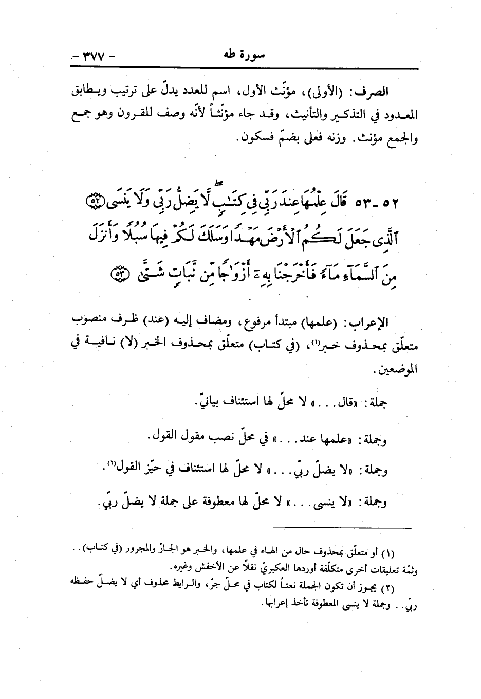 (22) (الفاء) عاطفة (دلّاهما) مثل قاسمهما (بغرور) جارّ ومجرور متعلّق بحال من ضمير المفعول «1» . (الفاء) استئنافيّة (لمّا) ظرف بمعنى حين متضمّن معنى الشرط مبنيّ في محلّ نصب متعلّق ب (بدت) ، (ذاقا) فعل ماض ... و (الألف) ضمير فاعل (الشجرة) مفعول به على حذف مضاف أي ثمر الشجرة، منصوب (بدت) فعل ماض مبني على الفتح المقدّر على الألف المحذوفة لالتقاء الساكنين. و (التاء) للتأنيث (لهما) مثل الأول متعلّق ب (بدت) ، (سوءات) فاعل مرفوع و (هما) ضمير مضاف إليه (الواو) عاطفة (طفقا) فعل ماض ناقص للشروع، و (الألف) ضمير اسم طفق (يخصفان) مضارع مرفوع وعلامة الرفع ثبوت النون. و (الألف) ضمير فاعل (على) حرف جرّ و (هما) ضمير في محلّ جرّ متعلّق ب (يخصفان) تجاوزا بتضمينه معنى يردان أو يهيلان ورق الجنّة عليهما (من ورق) جارّ ومجرور متعلّق بمحذوف نعت للمفعول به المقدّر أي يخصفان عليهما شيئا حاصلا من ورق الجنّة (الجنّة) مضاف إليه مجرور (الواو) عاطفة (ناداهما) مثل دلّاهما (ربّ) فاعل مرفوع و (هما) ضمير مضاف إليه (الهمزة) للاستفهام (لم) حرف نفي وقلب وجزم (أنه) مضارع مجزوم وعلامة الجزم حذف حرف العلّة و (كما) ضمير مفعول به (عن) حرف جرّ (تلكما) اسم إشارة مبني في محلّ جرّ متعلّق ب (أنه) ، و (اللام) للبعد و (كما) حرف خطاب المثنى (الشجرة) بدل من اسم الإشارة- أو عطف بيان- مجرور (الواو) عاطفة (أقل) مثل أنه ومعطوف عليه (اللام) حرف جرّ و (كما) ضمير في محلّ جرّ متعلّق ب (أقل) ، (إنّ) حرف مشبّه