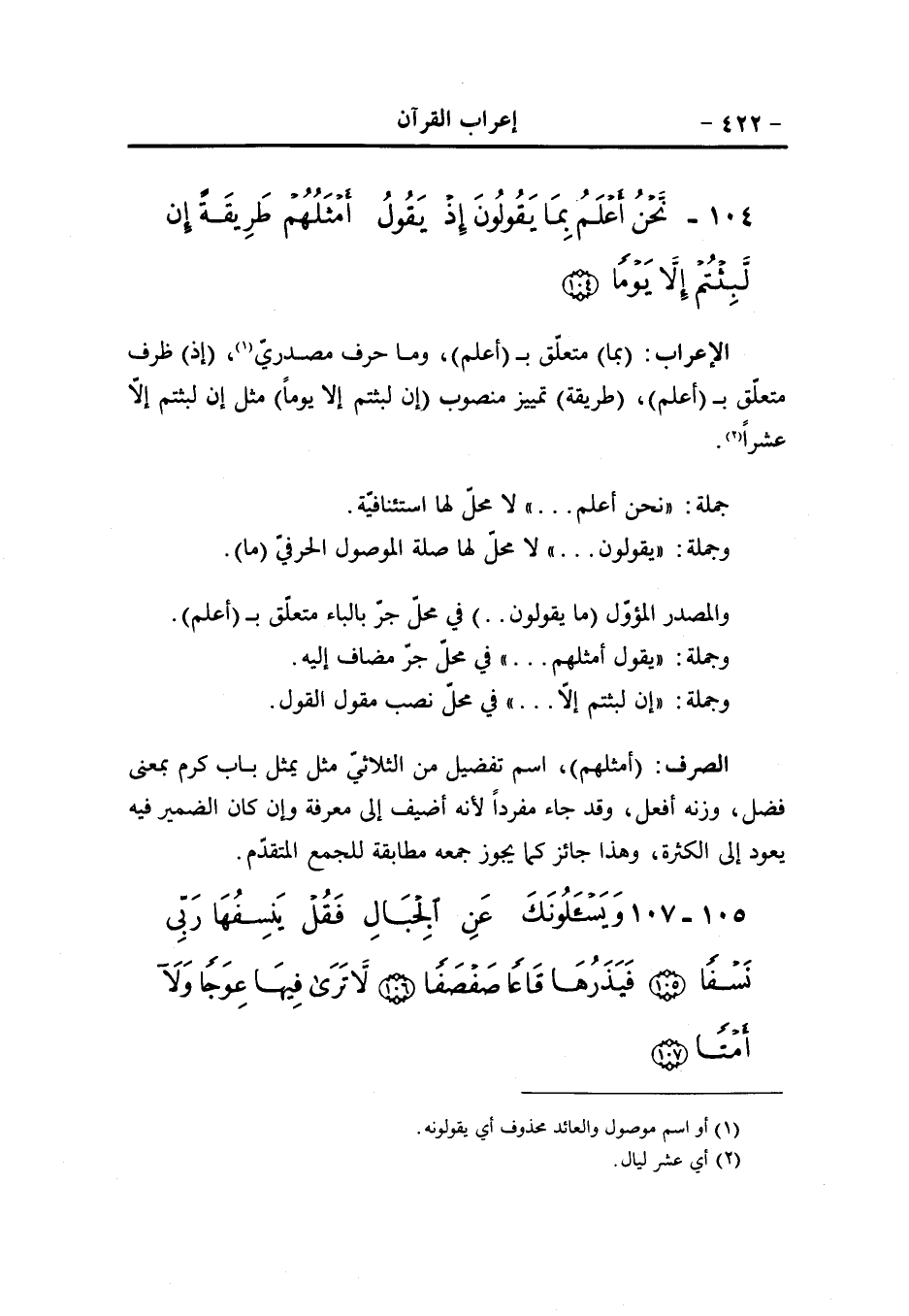 (الواو) استئنافيّة (نادى أصحاب الأعراف رجالا) مثل نادى أصحاب الجنة أصحاب «1» ، (يعرفونهم بسيماهم) مثل يعرفون كلّا بسيماهم «2» ، (قالوا) مثل السابق «3» ، (ما) حرف نفي (أغنى) فعل ماض مبنيّ على الفتح المقدّر على الألف (عن) حرف جرّ و (كم) ضمير في محلّ جرّ متعلّق ب (أغنى) ، (جمع) فاعل مرفوع و (كم) ضمير مضاف إليه (الواو) عاطفة (ما) حرف مصدريّ (كنتم) فعل ماض ناقص- ناسخ- مبني على السكون و (تم) ضمير اسم كان (تستكبرون) مضارع مرفوع ... والواو فاعل.