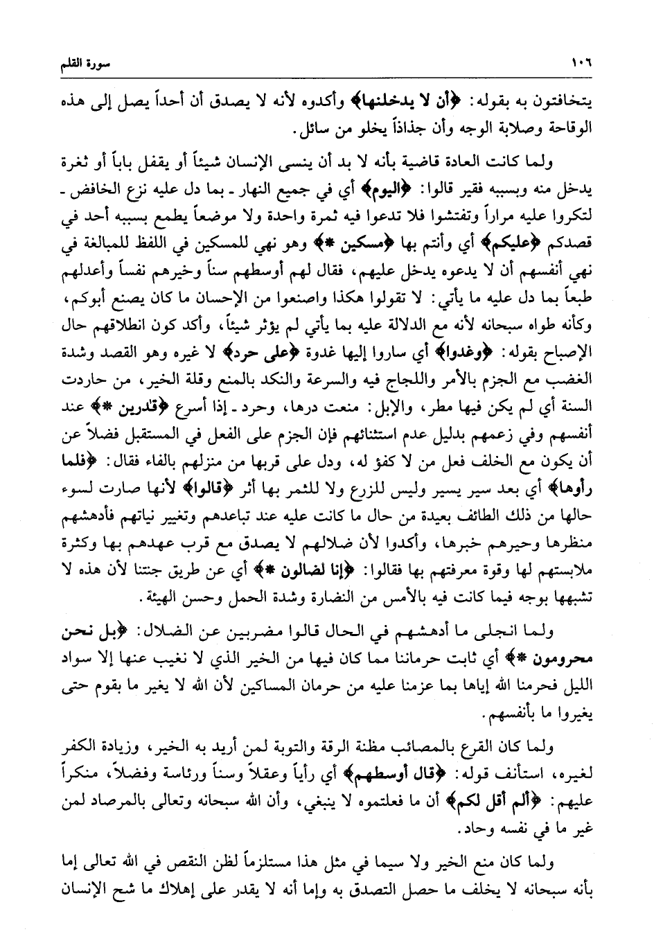 ولما كانت العادة قاضية بأنه لا بد أن ينسى الإنسان شيئاً أو يقفل باباً أو ثغرة يدخل منه وبسببه فقير قالوا : ( اليوم ) أي في جميع النهار - بما دل عليه نزع الخافض - لتكروا عليه مراراً وتفتشوا فلا تدعوا فيه ثمرة واحدة ولا موضعاً يطمع بسببه أحد في قصدكم ) عليكم ) أي وأنتم بها ) مسكين ( وهو نهي للمسكين في اللفظ للمبالغة في نهي أنفسهم أن لا يدعوه يدخل عليهم ، فقال لهم أوسطهم سناً وخيرهم نفساً وأعدلهم طبعاً بما دل عليه ما يأتي : لا تقولوا هكذا واصنعوا من الإحسان ما كان يصنع أبوكم ، وكأنه طواه سبحانه لأنه مع الدلالة عليه بما يأتي لم يؤثر شيئاً ، وأكد كون انطلاقهم حال الإصباح بقوله : ( وغدوا ) أي ساروا إليها غدوة ) على حرد ( لا غيره وهو القصد وشدة الغضب مع الجزم بالأمر واللجاج فيه والسرعة والنكد بالمنع وقلة الخير ، من حاردت السنة أي لم يكن فيها مطر ، والإبل : منعت درها ، وحرد - إذا أسرع ) قادرين ( عند أنفسهم وفي زعمهم بدليل عدم استثنائهم فإن الجزم على الفعل في المستقبل فضلاً عن أن يكون مع الخلف فعل من لا كفؤ له ، ودل على قربها من منزلهم بالفاء فقال : ( فلما رأوها ) أي بعد سير يسير وليس للزرع ولا للثمر بها أثر ) قالوا ( لأنها صارت لسوء حالها من ذلك الطائف بعيد من حال ما كانت عليه عند تباعدهم وتغيير نياتهم فأدهشهم منظرها وحيرهم خبرها ، وأكدوا لأن ضلالهم لا يصدق مع قرب عهدهم بها وكثرة ملابستهم لها وقوة معرفتهم بها فقالوا : ( إنا لضالون ) أي عن طريق جنتان لأن هذه لا تشبهها بوجه فيما كان فيه بالأمس من النضارة وشدة الحمل وحسن الهئة .