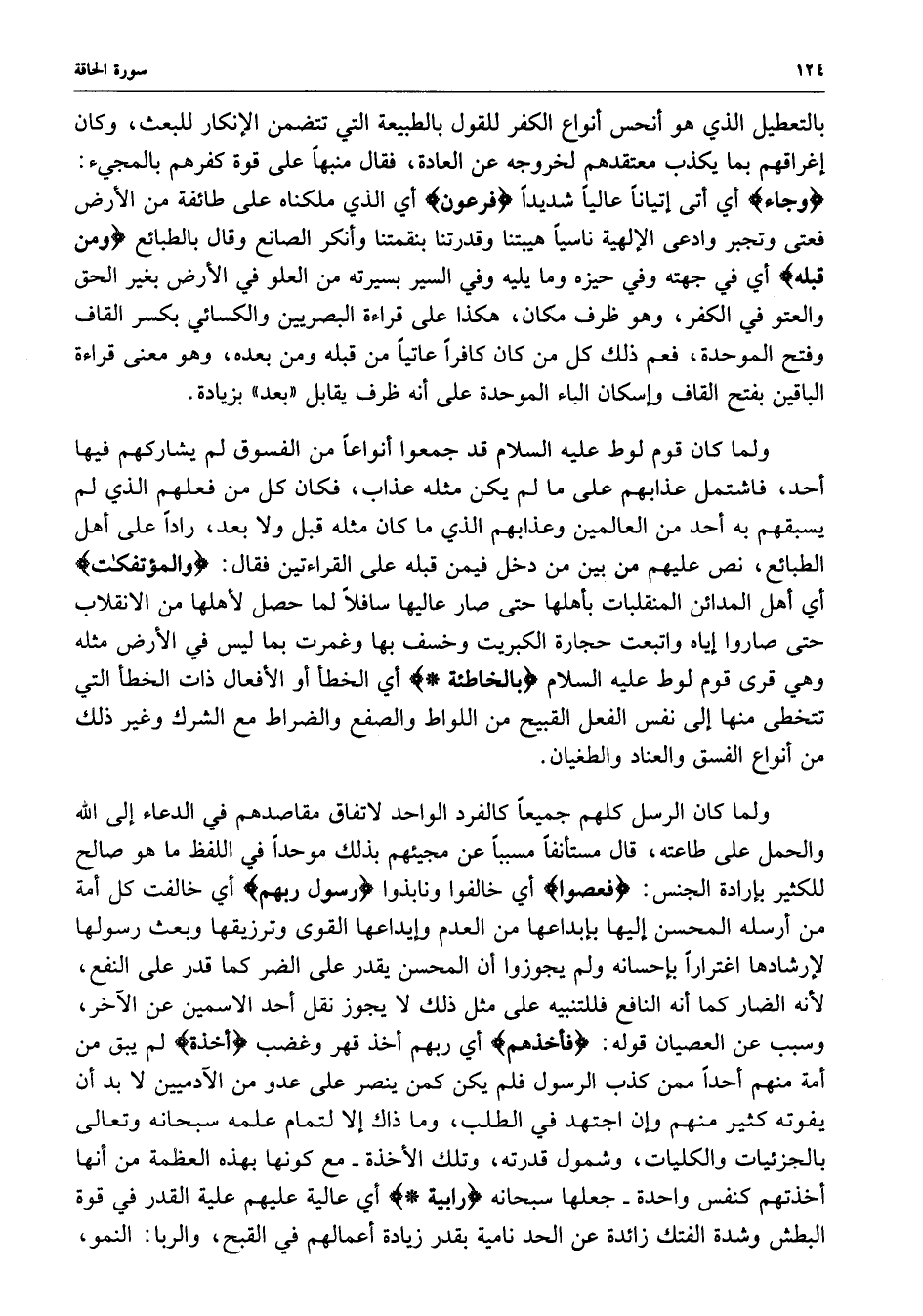ولما كان قوم لوط عليه السلام قد جمعوا أنواعاً من الفسوق لم يشاركهم فيها أحد ، فاشتمل عذابهم على ما لم يكن مثله عذاب ، فكان كل من فعلهم الذي لم يسبقهم به أحد من العالمين وعذابهم الذي ما كان مثله قبل ولا بعد ، راداً على أهل الطبائع ، نص عليه من بين من دخل فيمن قبله على القراءتين فقال : ( والمؤتفكات ) أي أهل المدائن المنقلبات بأهلها حتى صار عاليها سافلاً لما حصل لأهلها من الانقلاب حتى صاروا إياه واتبعت حجارة الكبريت وخسف بها وغمرت بما ليس في الأرض مثله وهي قرى قوم لوط عليه السلام ) بالخاطئة ) أي الخطأ أو الأفعال ذات الخطأ التي تتخطى منها إلى نفس الفعل القبيح من اللواط والصفع والضراط مع الشرك وغير ذلك من أنواع الفسق والعناد والطغيان .