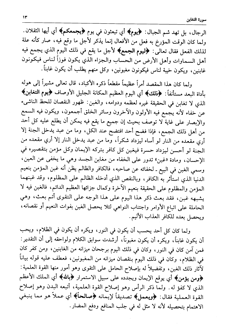 ولما كان هذا المقصد أمراً عظيماً مقطعاً ذكره الأكباد ، قال مشيراً إلى هوله بأداة البعد مستأنفاً : ( ذلك ) أي اليوم العظيم المكانة الجليل الأوصاف ) يوم التغابن ( الذي لا تغابن في الحقيقة غيره لعظمه ودوامه ، والغبن : ظهور النقصان للحظ الناشىء عن خفاء لأنه يجمع فيه الأولون والأخرون وسائر الخلق أجمعون ، ويكون فيه السمع والإبصار على غاية لا توصف بحث إن جميع ما يقع فيه يمكن أن يطلع عليه كل أحد من أهل ذلك الجمع ، فذا فضح أحد افتضح عند الكل ، وما عبد يدخل الجنة إلى أري مقعده نم النار لو أساء ليزداد شكراً ، وما من عبد يدخل النار إلا أري مقعده من الجنة لو أحسن ليزداد حسرة فيغبن كل كافر بتركه الإيمان وكل مؤمن بتقصيره في الإحسان ، ومادة ( غبن ) تدور على الخفاء من مغابن الجسد وهي ما يخفى عن العين ، وسمي الغبن في البيع - لخفائه عن صاحبه ، فالكافر والظالم يظن أنه غبن المؤمن بنعيم الدنيا الذي استأثر به الكافر ، وبالنقص الذي أدخله الظالم على المظلوم ، وقد غبنهما يشبه غبن ، فقد بعث ذكر هذا اليوم على هذا الوجه على التقوى اتم بعث ، وهي الحاملة على اتباع الأوامر واجتناب النواهي لئلا يحصل الغبن بفوات النعيم أو نقصانه ، ويحصل بعده للكافر العذاب الأليم .