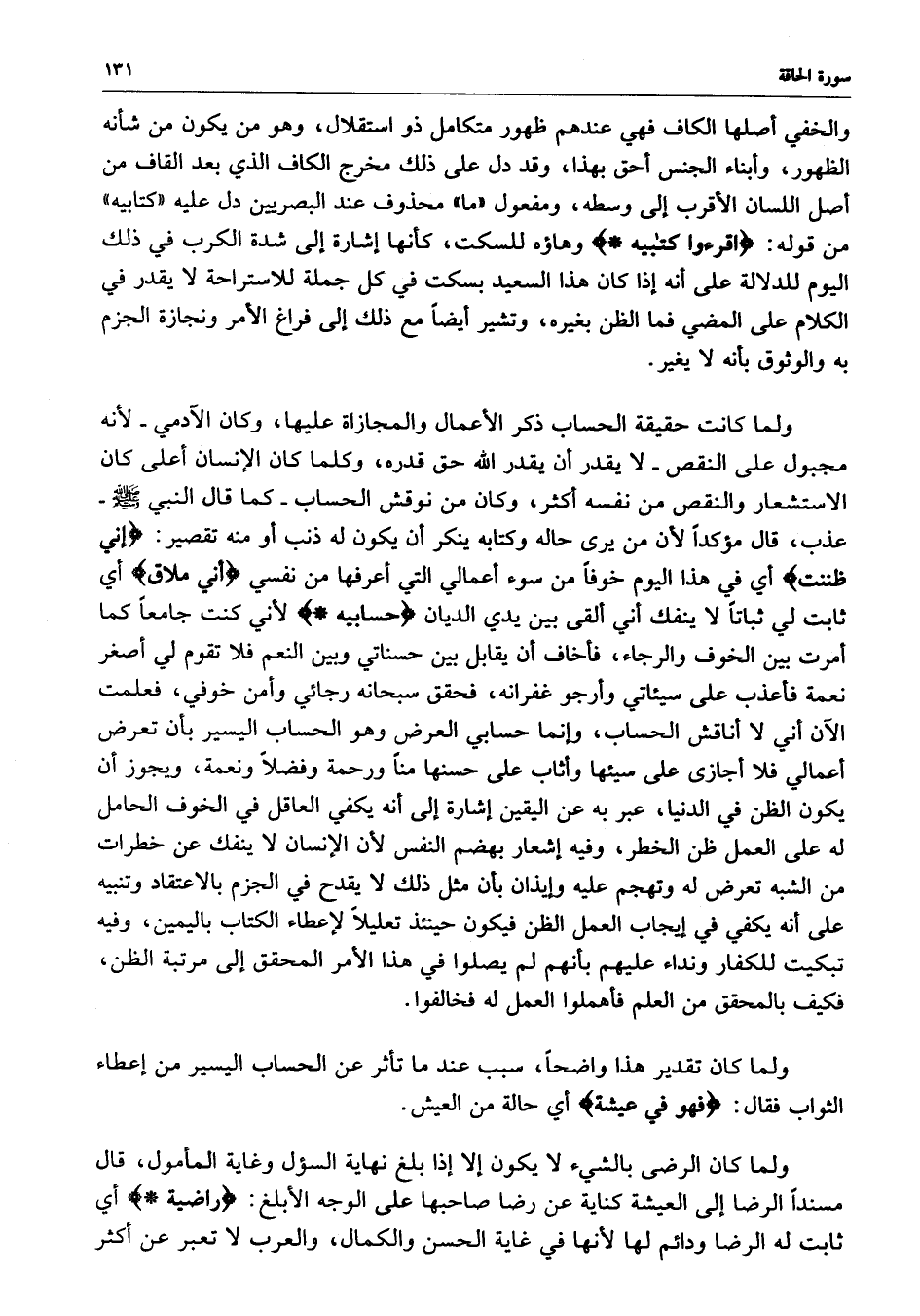 والخفي أصلها الكاف فهي عندهم ظهور متكامل ذو استقلال ، وهو من يكون من شأنه الظهور ، وأبناء الجنس أحق بهذا ، وقد دل على ذلك مخرج الكاف الذي بعد القاف من أصل اللسان الأقرب إلى وسطه ، ومفعول ( ما ) محذوف عند البصريين دل عليه ( كتابيه ) من قوله : ( اقرءوا كتابيه ( وهاؤه للسكت ، كأنها إشارة إلى شدة الكرب في ذلك اليوم للدلالة على أنه إذا كان هذا السعيد بسكت في كل جملة للاستراحة لا يقدر في الكلام على المضي فما الظن بغيره ، وتشير أيضاً مع ذلك إلى فراغ الأمر ونجازة الجزم به والوثوق بأنه لا يغير .