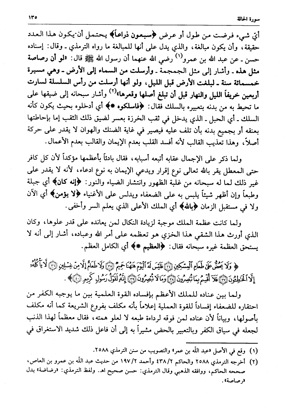أيّ شيء فرضت من طول أو عرض ) سبعون ذراعاً ( يحتمل أن يكون هذا العدد حقيقة ، وأن يكون مبالغة ، والذي يدل على أنها للمبالغة ما رواه الترمذي - وقال : إسناده حسن - عن عبد الله بن عمرو رضي الله عنهما أن رسول الله ( صلى الله عليه وسلم ) قال : ( لو أن رصاصة مثل هذه ) وأشار إلى مثل الجمجمة ( وأرسلت من السماء إلى الأرض - وهي مسيرة خمسمائة سنة - لبلغت الأرض قبل الليل ، ولو أنها أرسلت من رأس السلسلة لسارت أربعين خريفاً الليل والنهار قبل أن تبلغ أصلها وقعرها ) وأشار سبحانه إلى ضيقها على ما تحيط به من بدنه بتعبيره بالسلك فقال : ( فاسلكوه ) أي أدخلوه بحث يكون كأنه السلك - أي الحبل - الذي يدخل في ثقب الخرزة بعسر لضيق ذلك الثقب إما بإحاطتها بعنقه أو بجميع بدنه بأن تلف عليه فيصير في غاية الضنك والهوان لا يقدر على حركة أصلاً ، وهذا تعذيب القالب لأنه أفسد القلب بعدم الإيمان والقالب بعدم الأعمال .