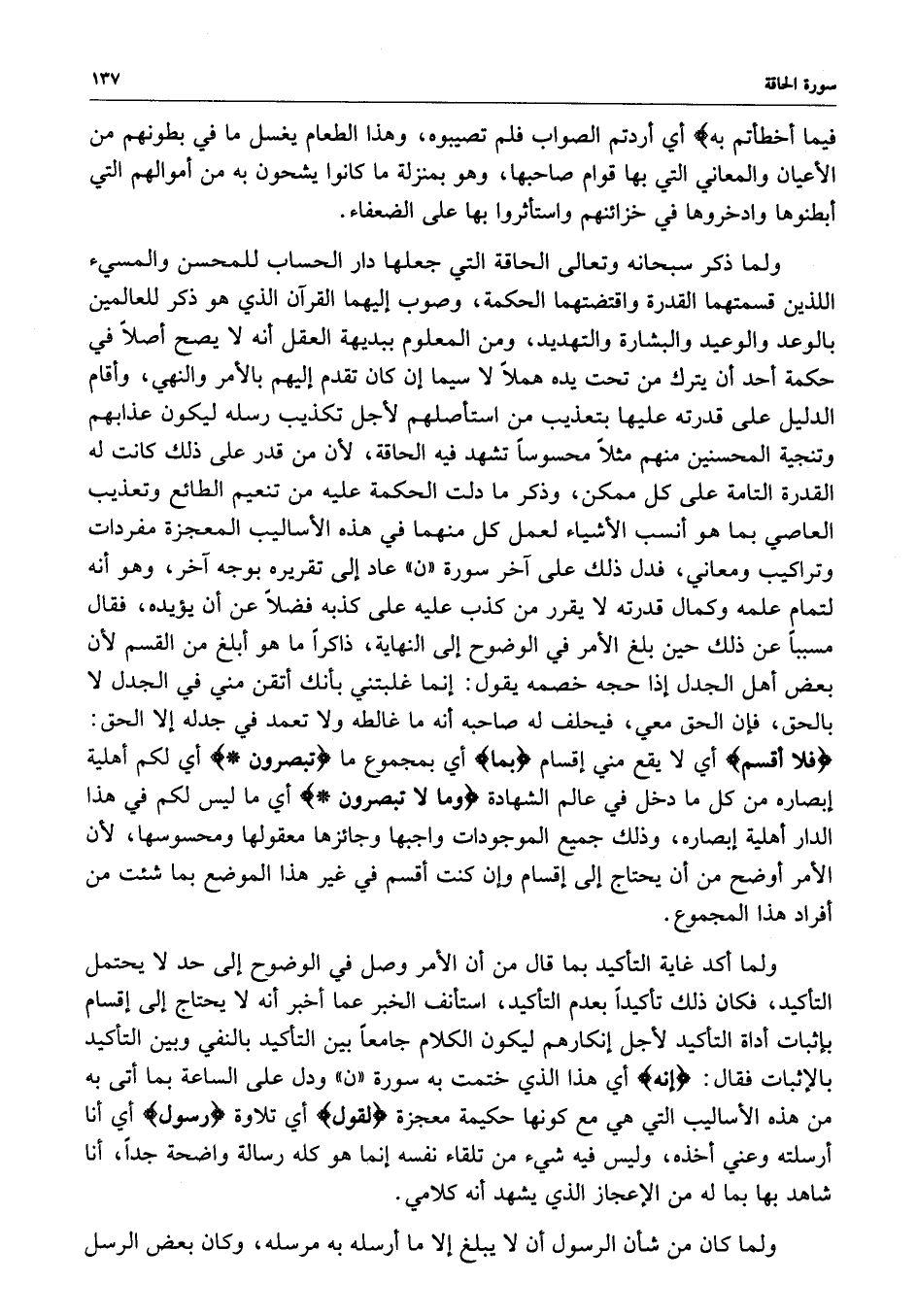 ولما ذكر سبحانه وتعالى الحاقة التي جعلها دار الحساب للمحسن والمسيء اللذين قسمتها القدرة واقتضتهما الحكمة ، وصوب إليهما القرآن الذي هو ذكر للعالمين بالوعد والوعيد والبشارة والتهديد ، ومن المعلوم ببديهة العقل أنه لا يصح أصلاً في حكمة أحد أن يترك من تحت يده هملاً لا سيما إن كان تقدم إليهم بالأمر والنهي ، وأقام الدليل على قدرته عليها بتعذيب من استأصلهم لأجل تكذيب رسله ليكون عذابهم وتنجية المحسنين منهم مثلاً محسوساً تشهد فيه الحاقة ، لأن من قدر على ذلك كانت له القدرة التامة على كل ممكن ، وذكر ما دلت الحكمة عليه من تنعيم الطائع وتعذيب العاصي بما هو أنسب الأشياء لعمل كل منهما في هذه الأساليب المعجزة مفردات وتراكيب ومعاني ، فدل ذلك على آخر سورة ( ن ) عاد إلى تقريره بوجه آخر ، وهو أنه لتمام علمه وكمال قدرته لا يقرر من كذب عليه على كذبه فضلاً عن أن يؤيده ، فقال مسبباً عن ذلك حين بلغ الأمر في الوضوح إلى النهاية ، ذاكراً ما هو أبلغ من القسم لأن بعض أهل الجدل إذا حجه خصمه يقول : إنما غلبتني بأنك أتقن مني في الجدل بالحق ، فإن الحق معي ، فيحلف له صاحبه أنه ما غالطه ولا تعمد في جدله إلا الحق ، ) فلا أقسم ) أي لا يقع مني إقسام ) بما ) أي بمجموع ما ) تبصرون ) أي لكم أهلية إبصاره من كل ما دخل في عالم الشهادة ) وما لا تبصرون ) أي ما ليس لكم في هذا الدار أهلية إبصاره ، وذلك جميع الموجودات واجبها وجائزها معقولها ومحسوسها ، لأن الأمر أوضح من أن يحتاج إلى إقسام وإن كنت أقسم في غير هذا الموضع بما شئت من أفارد هذا المجموع .