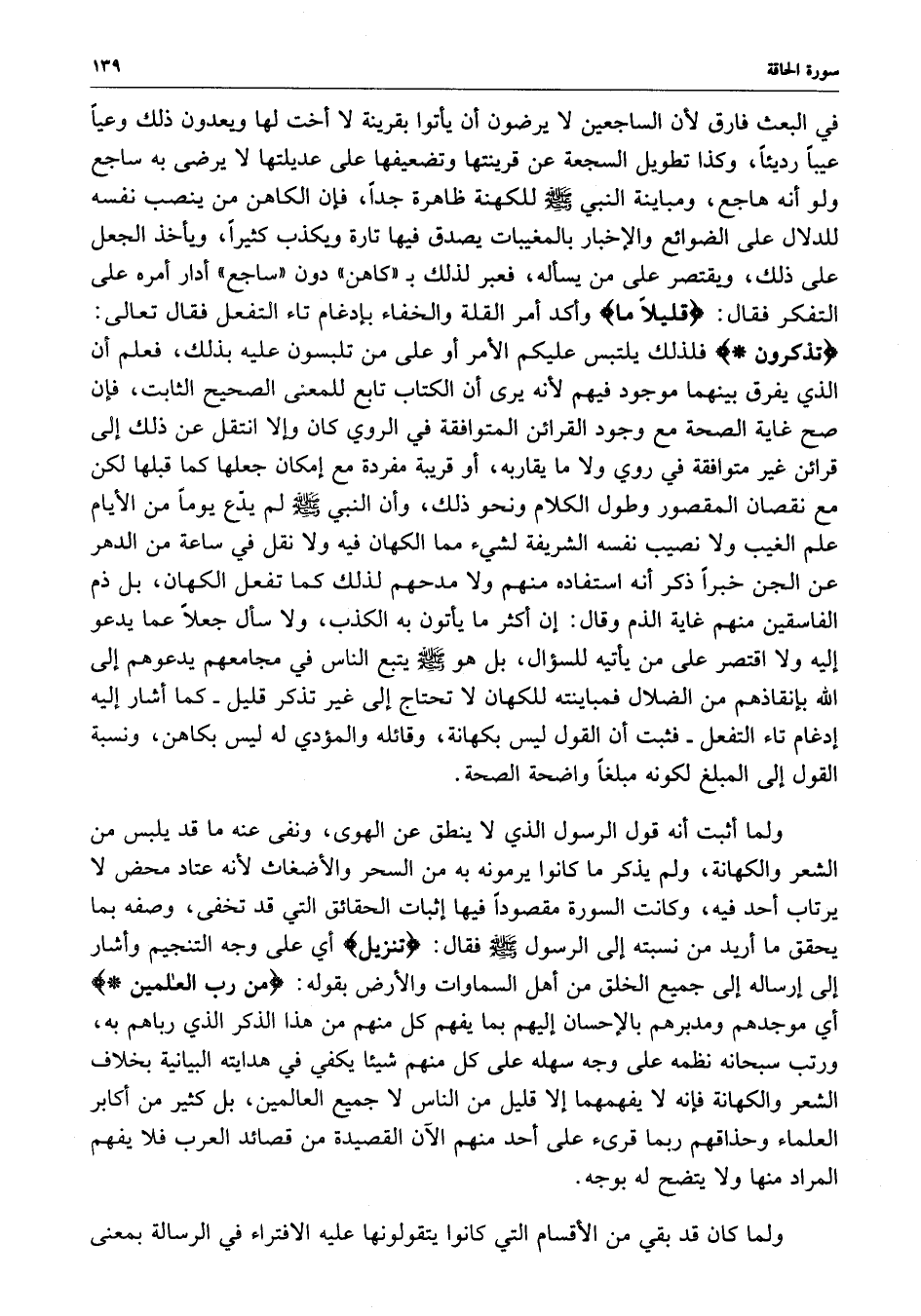 في البعث فارق لأن الساجعين لا يرضون أن يأتوا بقرينة لا أخت لها ويعدون ذلك وعياً عيباً رديئاً ، وكذا تطويل السجع عن قرينتها وتضعيفها على عديلتها لا يرضى به ساجع ولو أنه هاجع ، ومباينة النبي ( صلى الله عليه وسلم ) للكهنة ظاهرة جداً ، فإن الكاهن من ينصب نفسه للدلال على الضوائع والإخبار بالمغيبات يصدق فيها تارة ويكذب كثيراً ، ويأخذ الجعل على ذلك ، ويقتصر على من يسأله ، فعبر لذلك ب ( كاهن ) دون ( ساجع ) أدار أمره على التفكر فقال : ( قليلاً ما ( وأكد أمر القلة والخفاء بإدغام تاء التفعل فقال تعالى : ( تذكرون ( فلذلك يلتبس عليكم الأمر أو على من تلبسون عليه بذلك ، فعلم أن الذي يفرق بينهما موجود فيهم لأنه يرى أن الكتاب تابع للمعنى الصحيح الثابت ، فإن صح غاية الصحة مع وجود القرائن المتوافقة في الروي كان وإلا انتقل عن ذلك إلى قرائن غير متوافقة في روي ولا ما يقاربه ، أو قريبة مفردة مع إمكان جعلها كما قبلها لكن مع نقصان المقصور وطول الكلام ونحو ذلك ، وأن النبي ( صلى الله عليه وسلم ) لم يدّع يوماً من الأيام علم الغيب ولا نصيب نفسه الشريفة لشيء مما الكهان فيه ولا نقل في ساعة من الدهر عن الجن خبراً ذكراً أنه استفاده منهم ولا مدحهم لذلك كما تفعل الكهان ، بل ذم الفاسقين منهم غاية الذم وقال : إن أكثر ما يأتون به الكذب ، ولا سأل جعلاً عما يدعو إليه ولا اقتصر على من يأتيه اللسؤال ، بل هو ( صلى الله عليه وسلم ) يتبع الناس في مجامعهم يدعوهم إلى الله بإنقاذهم نم الضلال فمباينته للكهان لا يحتاج إلى غير تذكر قليل - كما أشار إليه إدغام تاء التفعل - فثبت أن القول ليس بكهانة ، وقائله والمؤدي له ليس بكاهن ، ونسبة القول إلى المبلغ لكونه مبلغاً واضحة الصحة .