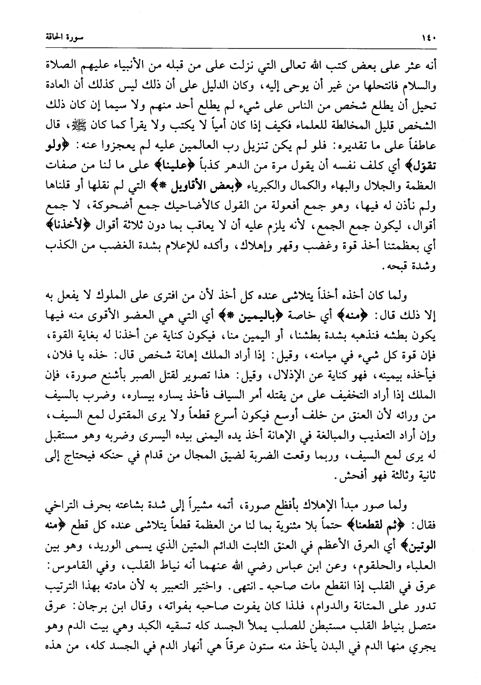 أنه عثر على بعض كتب الله تعالى التي نزلت على من قبله من الأنبياء عليهم الصلاة والسلام فانتحلها من غير أن يوحى إليه ، وكان الدليل على أن ذلك ليس كذلك أن العادة تحيل أن يطلع شخص من الناس على شيء لم يطلع أحد منهم ولا سيما إن كان ذلك الشخص قليل المخالطة للعلماء فكيف إذا كان أمياً لا يكتب ولا يقرأ كما كان ( صلى الله عليه وسلم ) ، قال عاطفاً على ما تقديره : فلو لم يكن تنزيل رب العالمين عليه لم يعجزوا عنه : ( ولو تقوّل ) أي كلف نفسه أن يقول مرة من الدهر كذباً ) علينا ( على ما لنا من صفات العظمة والجلال والبهاء والكمال والكبرياء ) بعض الأقاويل ( التي لم نقلها أو قلناها ولم نأذن له فيها ، وهو جمع أفعولة من القول كالأضاحيك جمع أضحوكة ، لا جمع أقوال ، ليكون جمع الجمع ، لأنه يلزم عليه أن لا يعاقب بما دون ثلاثة أقوال ) لأخذنا ) أي بعظمتنا أخذ قوة وغضب وقهر وإهلاك ، وأكده للإعلام بشدة الغضب من الكذب وشدة قبحه .