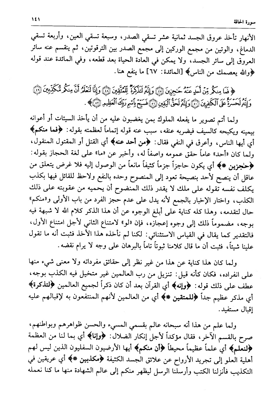 ) فَمَا مِنكُمْ مِّنْ أَحَدٍ عَنْهُ حَاجِزِينَ وَإِنَّهُ لَتَذْكِرَةٌ لِّلْمُتَّقِينَ وَإِنَّا لَنَعْلَمُ أَنَّ مِنكُمْ مُّكَذِّبِينَ وَإِنَّهُ لَحَسْرَةٌ عَلَى الْكَافِرِينَ وَإِنَّهُ لَحَقُّ الْيَقِينِ فَسَبِّحْ بِاسْمِ رَبِّكَ الْعَظِيمِ ( ( )