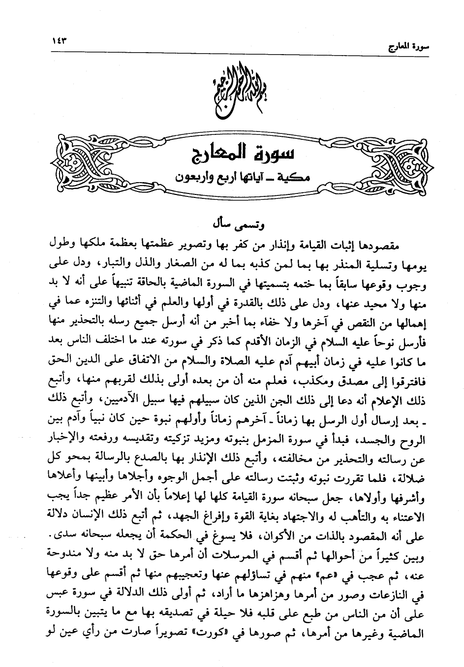 مقصودها إثبات القيامة وأنذار من كفر بها وتصوير عظمتها بعظمة ملكها وطول يومهت وتسلية المنذر بها بما لمن كذبه بما له من الصغار والذل والتبار ، ودل على وجوب وقوعها سابقا بما ختمه بتسميتها في السورة الماضية بالحاقة تنبيها على أنه لا بد منها ولا محيد عنها ، ودل على ذلك بالقدرة في أ ، لها والعلم في اثنائها والتنزه عما في إهمالها من النقص في آخرها ولا خفاء بما أخبر من أنه أرسل جميع رسله بالتحذير منها فأرسل نوحا عليه السلام يفي الزمان الأقدم كما ذكر في سورته عند ما اختلف الناس بعدما كانوا عليه يفي زمان أبيهم آدم عليه الصلاة والسلام من الاتفاق على الدين الحق فافترقوا إلى مصدق ومكذب ، فعلم منه أ ، من بعده أولى بذلك لقربهم منها وأتبع ذلك الإعلام أنه دعاإلى ذلك الجن الذين كان سبيلهم فيها سبيل الآدميين ، وأتبع ذلك بعد إرسال أول الرسل بها زمانا - آخرهم زمانات وأولهم نبوة حين كان نبيا وآدم بين الروح والجسد ، فبدا بسورة المزمل بنبوته ومزيد ترزكيته وتقديسه ورفعته والإخبار عن رسالته والتحذي من مخالفته ، وأتبع ذلك الإنذار بها بالصدع بالرسالة بمحو كل ضلالة ، فلما تقررت نبوته وثبتت رسالته على أجمل الوجوه وأجلاها وأبينها وأعلاها ، اشرفها وأولاها ، جعل سبحانه سورة القيامة كلها لها إعلاما بأن الأمر عظيم جدا يجب الاعتناء به والتأهب له والاجتهاد بغاية القوة وإفراغ الجهد ، ثم اتبع ذلك الإنسان دلالة على أنه المقصود بالذات من الأكوان ، فاليسوغ في الحكمة أن يجعله سبحانه سدى وبين كثيرا من أحوالها ثم أقسم في المرسلات أن أملاها حق لا بد منه ولا مندوحة عنه ، ثم عجب في " عم " منهم في تساؤلهم عنها وتعجيبهم منها ثم أقسم على زقزعها في النازعات وصور من أمرها وهزاهزها ما أراد ، ثم أولى ذلك الدلالة في سورة عبس على أن من الناس من طبع على قلبه فلا حيله في تصديقه بها مع ما تبين بالسورة الماضية وغيرها من أمرها ، ثم صورها في " كورت " تصوير صارت من رأي عين لو