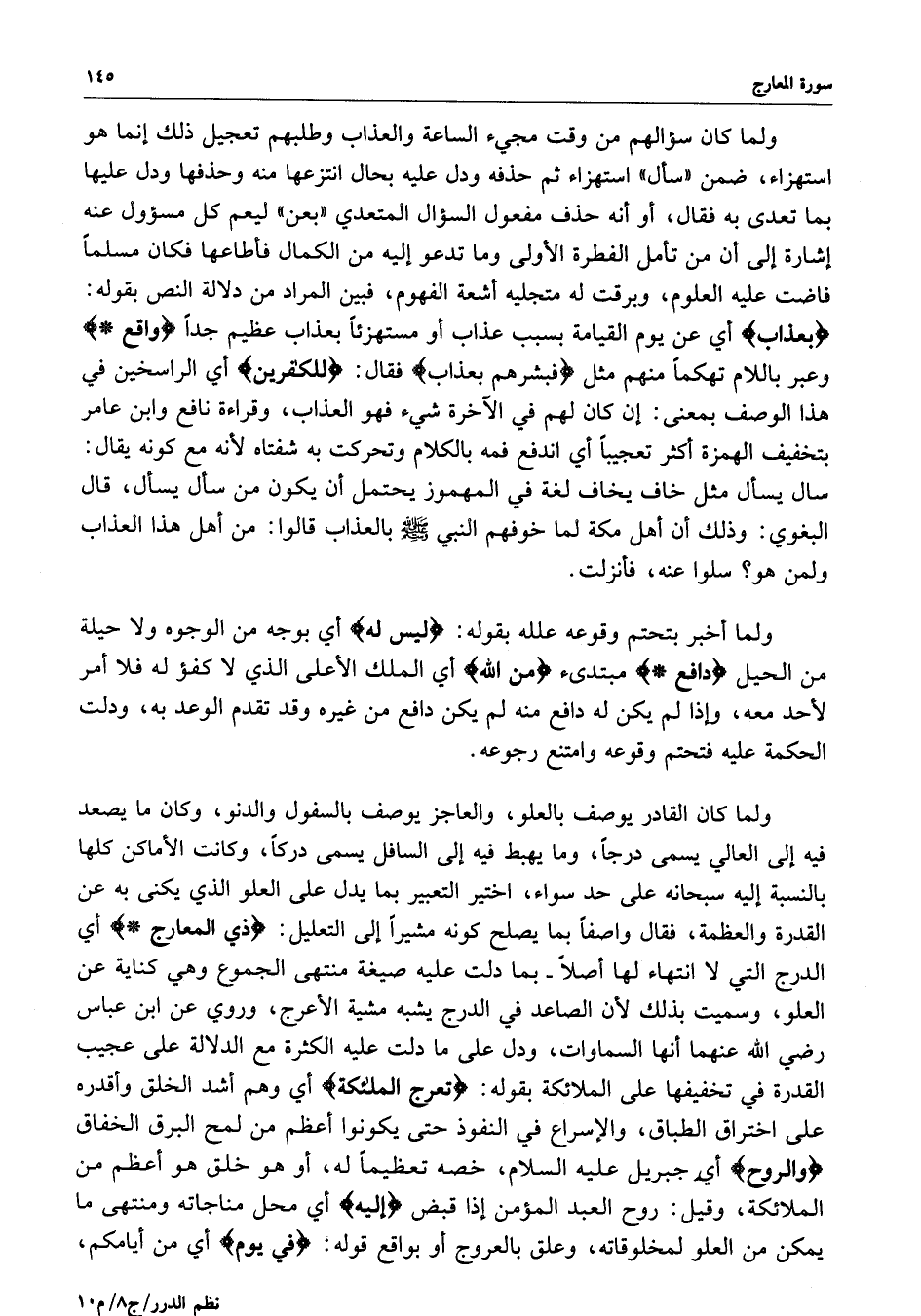 ولما كان القادر يوصف بالعلو ، والعاجز يوسف بالسفول والدنو ، وكان ما يصعد فيه إلى العالي يسمى درجاً ، وما يهبط فيه إلى السافل يسمى دركاً ، وكانت الأماكن كلها بالنسبة إليه سبحانه على حد سواء ، اختير التعبير بما يدل على العلو الذي يكنى به عن القدرة والعظمة ، فقال واصفاً بما يصلح كونه مشيراً إلى العديل : ( ذي المعارج ) أي الدرج التي لا انتهاء لها أصلاً - بما دلت عليه صيغة منتهى الجموع وهي كناية عن العلو ، وسيمت بذلك لأن الصاعد في الدرج يشبه مشية الأعرج ، وروي عن ابن عباس رضي الله عنهما أنها السماوات ، ودل على ما دلت عليه الكثرة مع الدلالة على عجيب القدرة في تخفيفها على الملائكة بقوله : ( تعرج الملائكة ) أي وهم أشد الخلق وأقدره على اختراق الطباق ، والإسراع في النفوذ حتى يكونوا أعظم من لمح البرق الخفاق ) والروح ) أي جبريل عليه السلام ، خصه تعظيماً له ، أو هو خلق هو أعظم من الملائكة ، وقيل : روح العبد المؤمن إذا قبض ) إليه ) أي محل مناجاته ومنتهى ما يمكن من العلو لمخلوقاته ، وعلق بالعروج أو بواقع قوله : ( في يوم ) أي من أيامكم ،