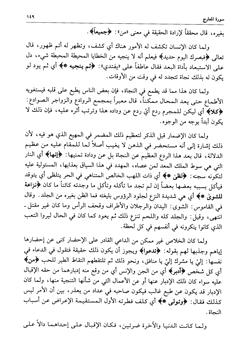 ولما كان الإضمار قبل الذكر لتعظيم ذلك المضمر في المهيع الذي هو فيه ، لأن ذلك إشارة إلى أنه مستحضر في الذهي لا يغيب أصلاً لما للمقام عليه من عظيم الدلالة ، قال بعد هذا الردع العظيم عن النجاة بل عن ودادة تمنيا : ( إنها ) أي النار التي هي سوط الملك المعد لمن عصاه ، المهدد في هذا السياق بعذابها ، المستولية عليه لتكونه سجنه : ( لظى ) أي ذات اللهب الخالص المتناهي في الحر يتلظى أي يتوقد فيأكل بسببه بعضها بعضاً إن لم تجد ما تأكله وتأكل ما وجدته كائناً ما كان ) نزاعة للشوى ) أي هي شديدة النزع لجلود الرؤوس بلغيته فما الظن بغيره من الجلد ، وقال في القاموس : الشوى : اليدان والرجلان والأطراف وقحف الرأس وما كان غيره مقتل - انتهى ، وقيل : والجلد كله واللحم تنزع ذلك ثم يعود كماكان في الحال يروا التعب الذي كانوا ينكرونه في أنفسهم في كل لحظة .