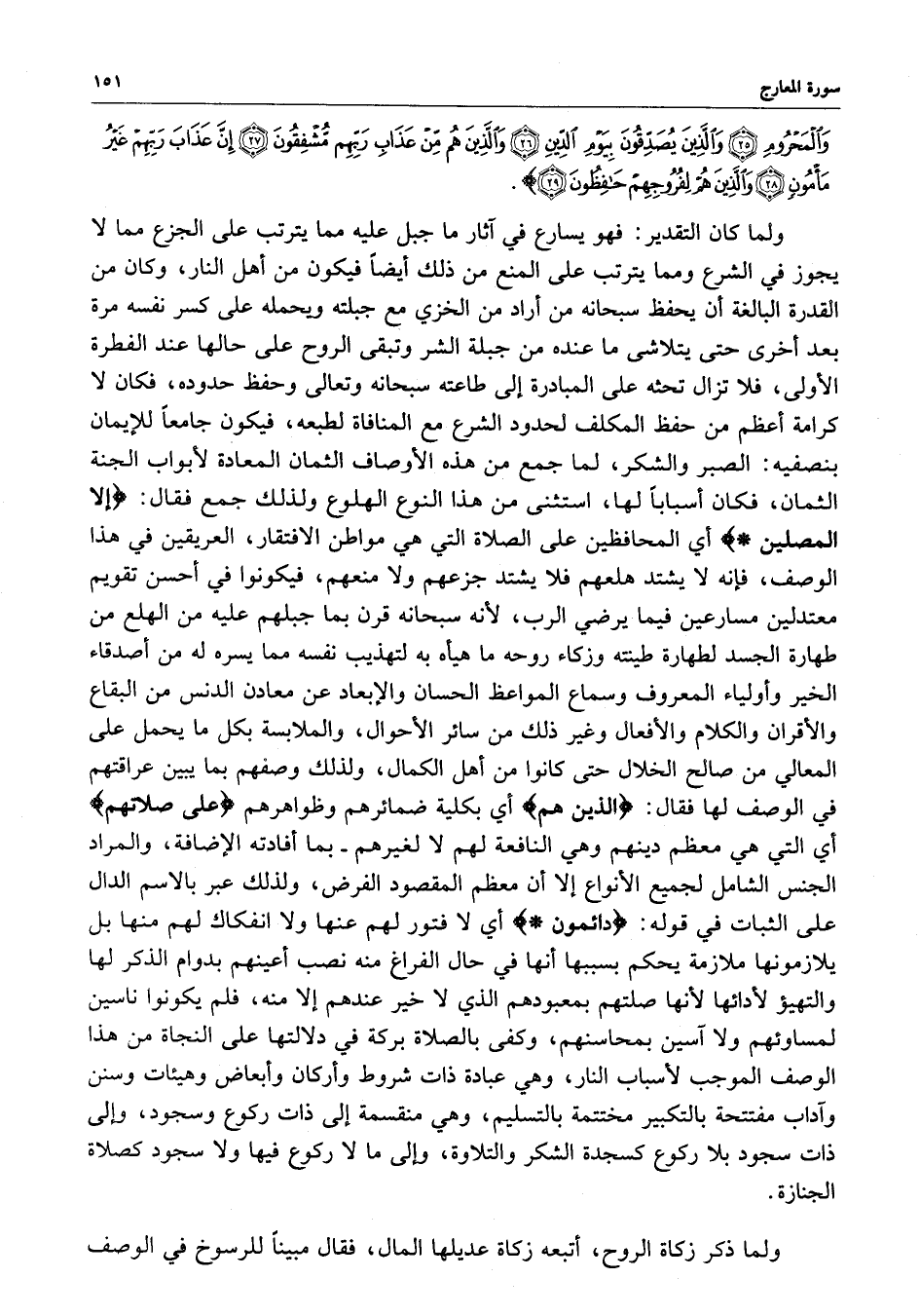التقدير : فهو يسارع في آصار ما جبل عليه ما يترتب على الجزع مما لا يجوز في الشرع ومما يترتب على المنع من ذلك أيضاً فيكون من أهل النار ، وكان من القدرة البالغة أن يحفظ سبحانه من أراد من الخزي مع جبلته ويحمله على كسر نفسه مرة بعد أخرى حتى يتلاشى ما عنده من جبلة الشر وتبقى الروح على حالها عند الفطرة الأولى ، فلا تزال تحثه على المبادرة إلى طاعته سبحانه وتعالى وحفظ حدوده ، فكان لا كرامة أعظم من حفظ المكلف لحدود الشرع مع المنافاة لطبعه ، فيكون جامعاً للإيمان بنصفيه : الصبر والشكر ، لما جمع من هذه الأوصاف الثمان المعادة لأبواب الجنة الثمان ، فكان أسباباً لها ، استثنى من هذا النوع الهلوع ولذلك جمع فقال : ( إلا المصلين ) أي المحافظين على الصلاة التي هي مواطن الافتقار ، العريقين في هذا الوصف ، فإنه لا يشتد هلعهم فلا يشتد جزعهم ولا منعهم ، فيكونوا في أحسن تقويم معتدلين مسارعين فيما يرضي الرب ، لأنه سبحانه قرن بما جبلهم عليه من الهلع من طهارة الجسد لطهارة طينته وزكان روحه ما هيأه لتهذيب نفسه مما يسره له من أصدقاء الخير وأولياء المعروف وسماع المواعظ الحسان والإبعاد عن معادن الدنس من البقاع والأقران والكلام والأفعال وغير ذلك من سائر الأحوال ، والملابسة بكل ما يحمل على المعالي من صالح الخلال حتى كانوا من أهل الكمال ، ولذلك وصفهم بما يبين عراقتهم في الوصف لها فقال : ( الذين هم ) أي بكلية ضمائرهم وظواهرهم ) على صلاتهم ) أي التي هي معظم دينهم وهي النافعة لهم لا لغيرهم - بما أفادته الإضافة ، والمراد الجنس الشامل لجميع الأنواع إلا أن معظم المقصود الفرض ، ولذلك عبر بالاسم الدال على الثبات في قوله : ( دائمون ) أي لا فتور لهم عنها ولا انفكاك لهم منها بل يلازمونها ملازمة يحكم بسببها أنها في حال الفراغ منه نصب أعينهم بدوام الذكر لها والتهيؤ لأدائها لأنها صلتهم بمعبودهم الذي لا خير عندهم إلا منه ، فلم يكونوا ناسين لمساؤئهم ولا آسين بمحاسنهم ، وكفى بالصلاة بركة في دلالتها على النجاة من هذا الوصف الموجب لأسباب النار ، وهي عبادة ذات شروط وأركان وأبعاض وهيئات وسنن وآداب مفتتحة بالتكبير مختتمة بالتسليم ، وهي منقسمة إلى ذات ركوع وسجود ، وإلى ذات سجود بلا ركوع كسجدة الشكر والتلاوة ، وإلى ما لا ركوع فيها ولا سجود كصلاة الجنازة .